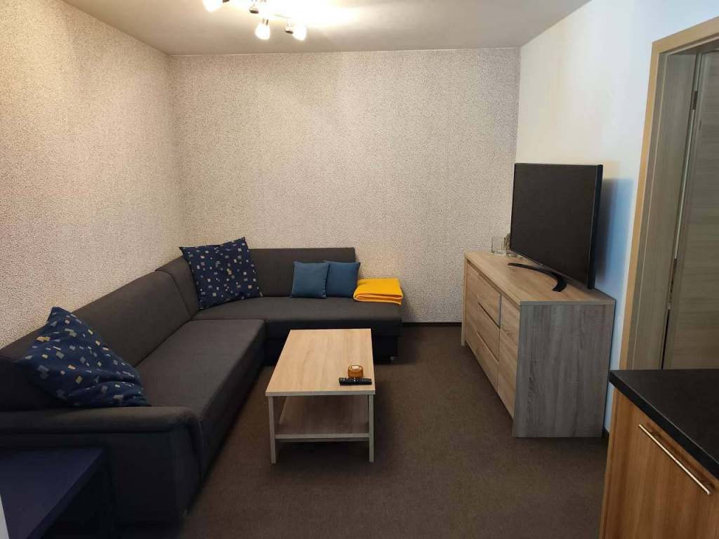 Apartmán zelený (kapacita 5 lidí): 1x ložnice (manželská postel + 1 lůžko extra), obývací pokoj s TV (rozkládací sedací souprava 2 lůžka) + kuchyňský kout + jídelna, koupelna, WC.