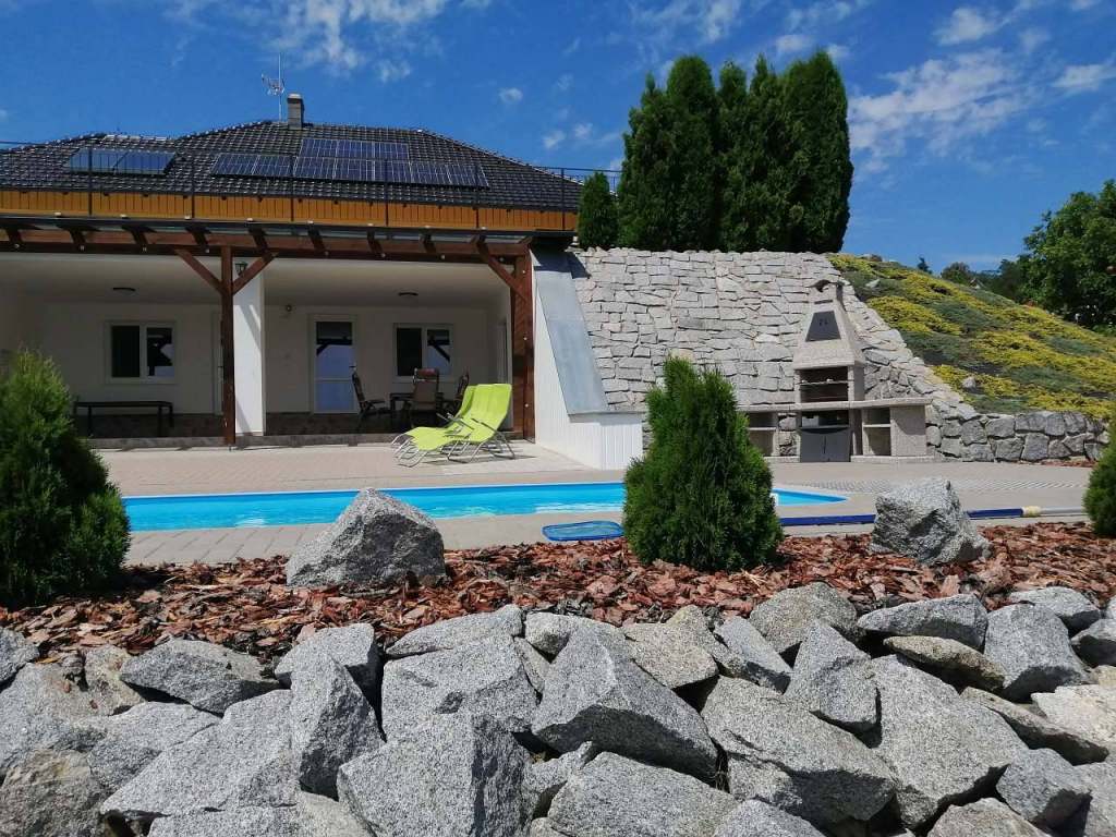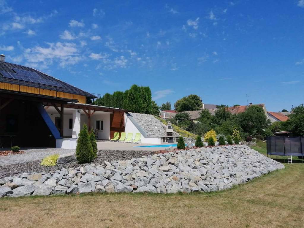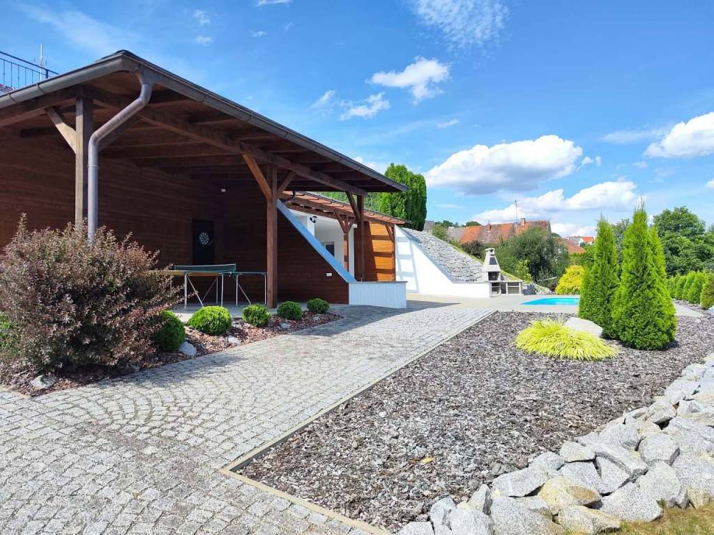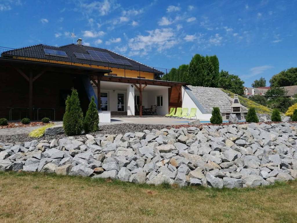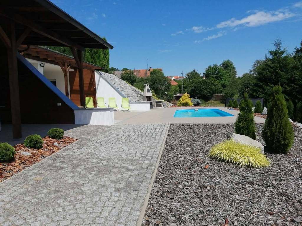 Společné pro apartmány: Oplocený pozemek, venkovní zapuštěný bazén 7,5 x 4 m s barevným osvětlením, 2x venkovní zastřešená osvětlená terasa, zahradní nábytek, velký krbový gril, stolní tenis, el. šipky, trampolína, lehátka.