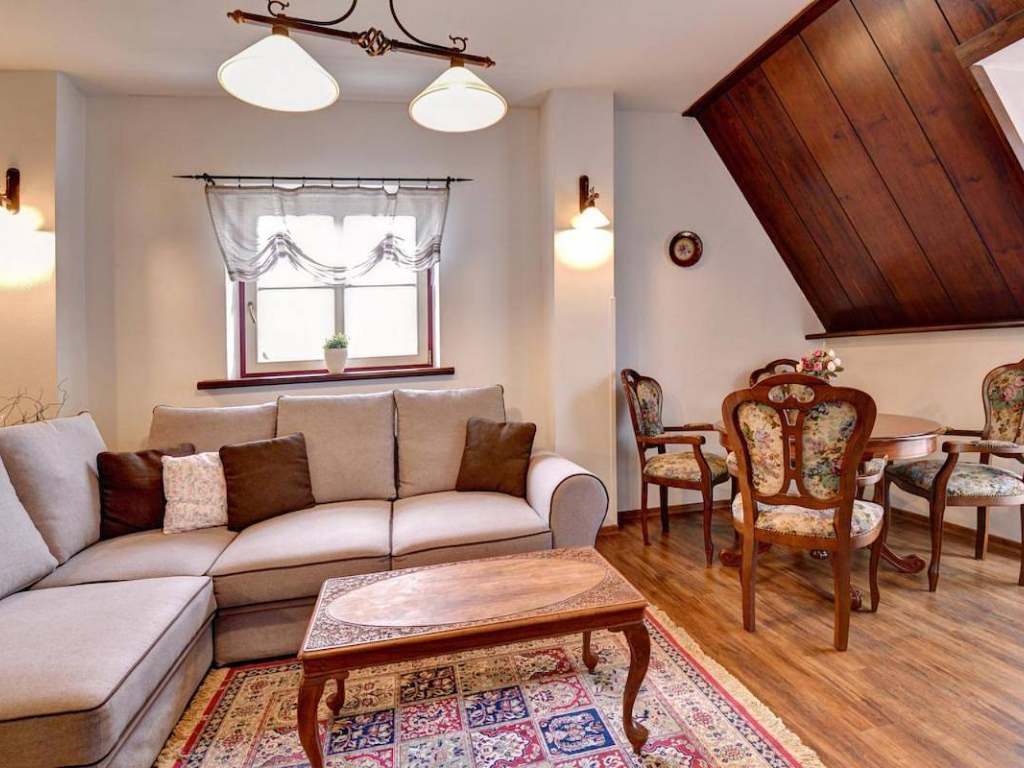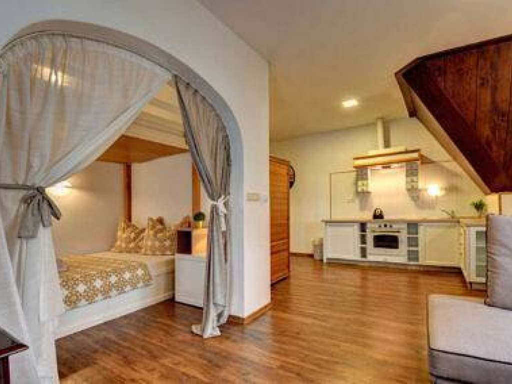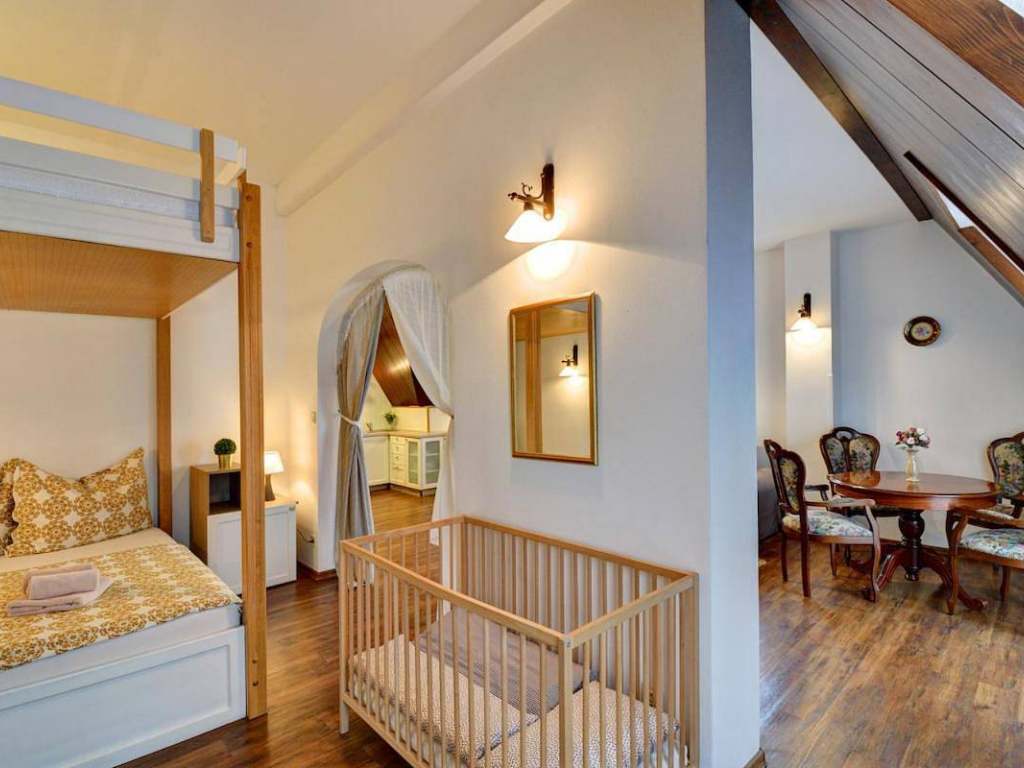 Apartmán 3 - luxusní studiový apartmán se saunou o velikosti 60 m2,vhodný pro 4 osoby + přistýlka pro 2 osoby na rozkládací pohovce v obývací části. V ložnici, která je zčásti oddělená naleznete manželskou postel a prostornou patrovou postel. Dále je zde obývací pokoj s posezením a jídelním stolem, TV, vybavená kuchyň. Součástí apartmánu je koupelna se sprchovým koutem, vanou a toaletou. Apartmán disponuje infrasaunou a 2 balkóny s výhledem na náměstí.