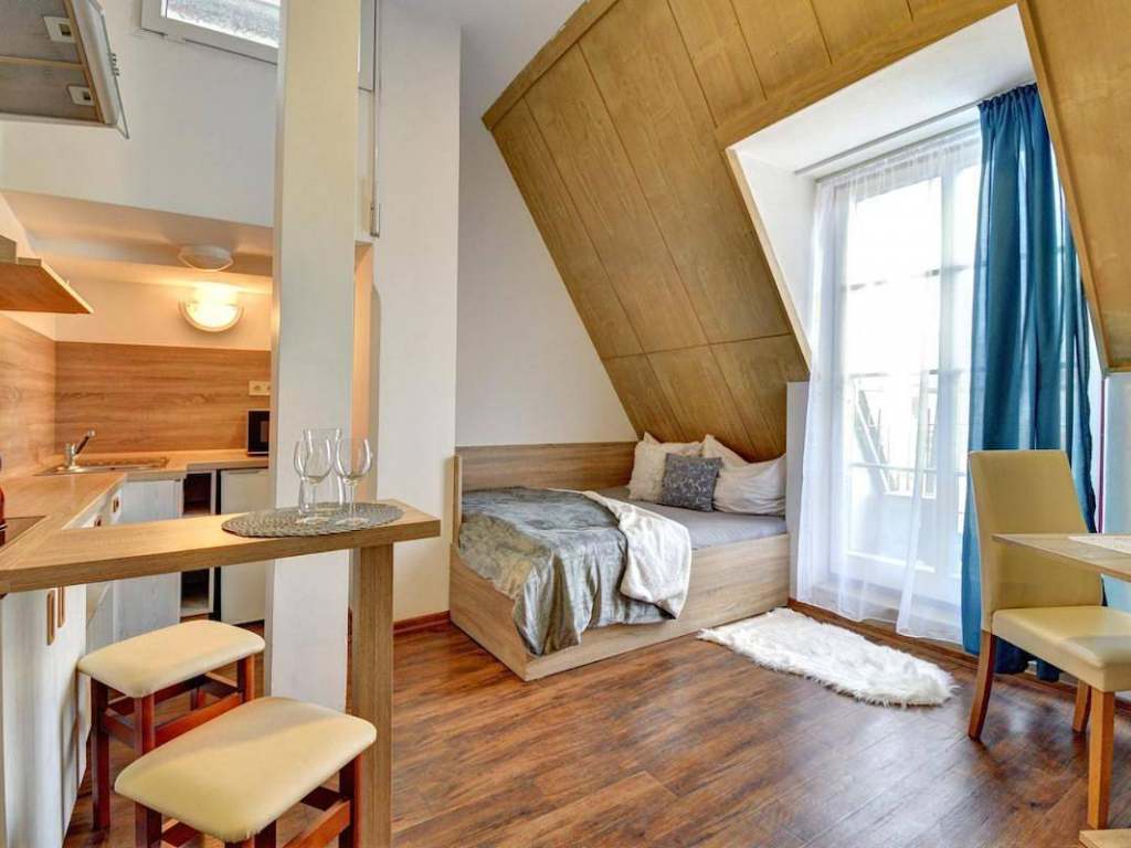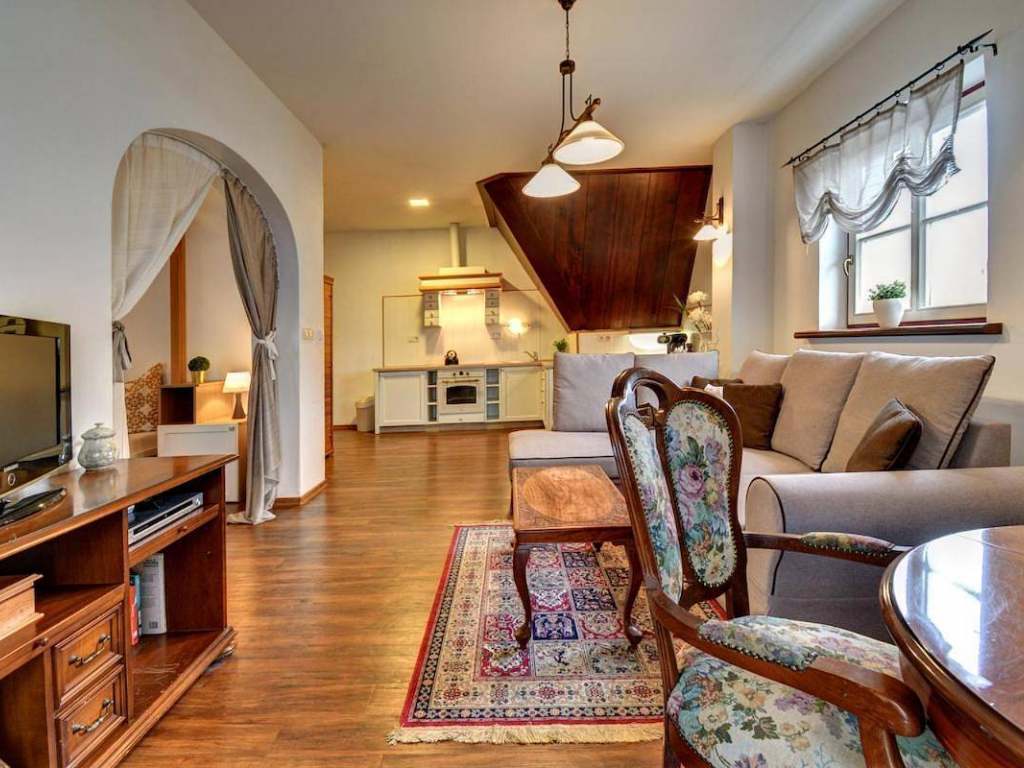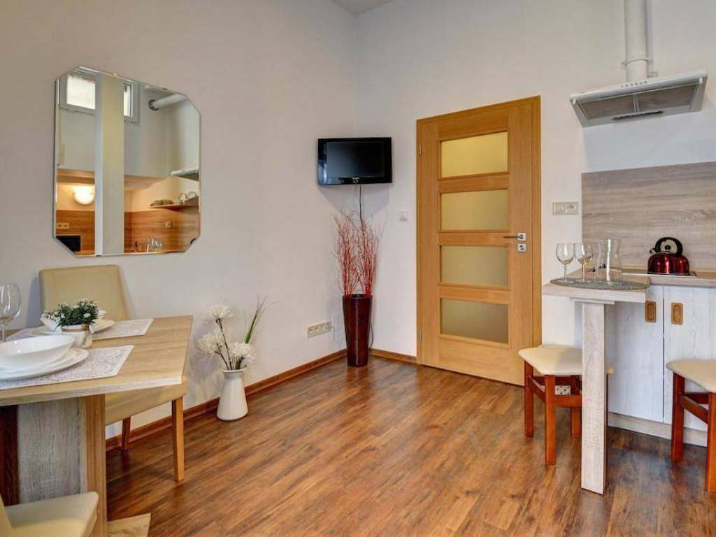 Apartmán 1 - dvoulůžkový apartmán o velikosti 26 m2.Nachází se zde vybavená kuchyňská linka, jídelní stůl, TV a manželská postel s pohodlnou matrací King Koil. Součástí je koupelna se sprchovým koutem a toaletou. Apartmán má balkón s výhledem na náměstí.