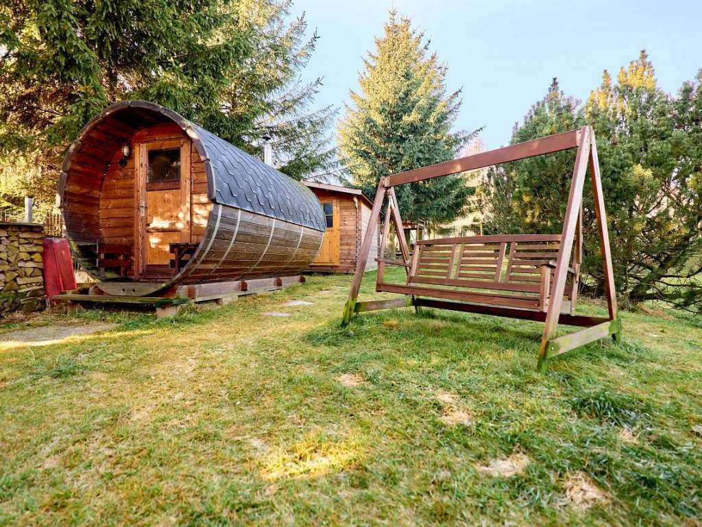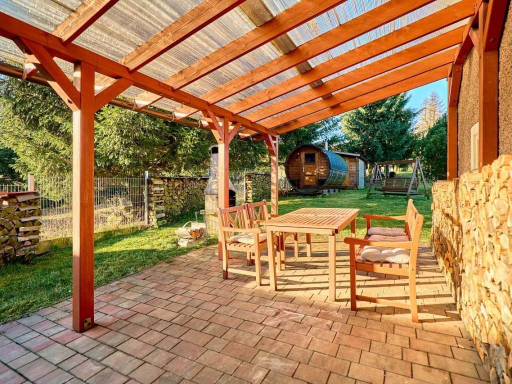Na zahradě se nachází krytý přístřešek, venkovní posezení a za příplatek sauna.