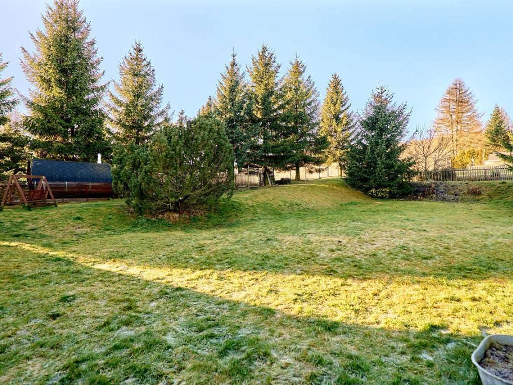 Zahrada - celá oplocená, s výhledem na louky a lesy. Venkovní sezení u grilu. Sauna