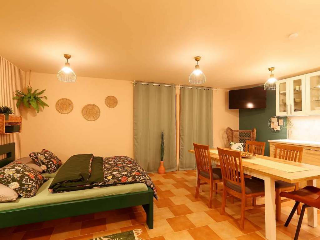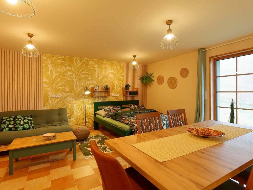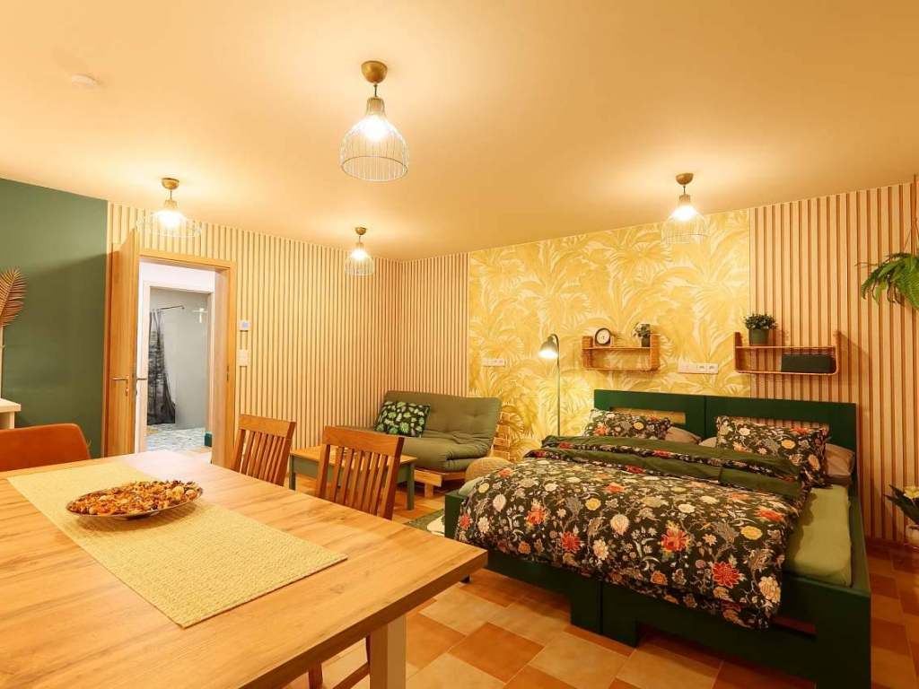 Ap. 1: Apartmán s výhledem do zahrady – dvě lůžka a rozkládací pohovka pro 2 osoby.