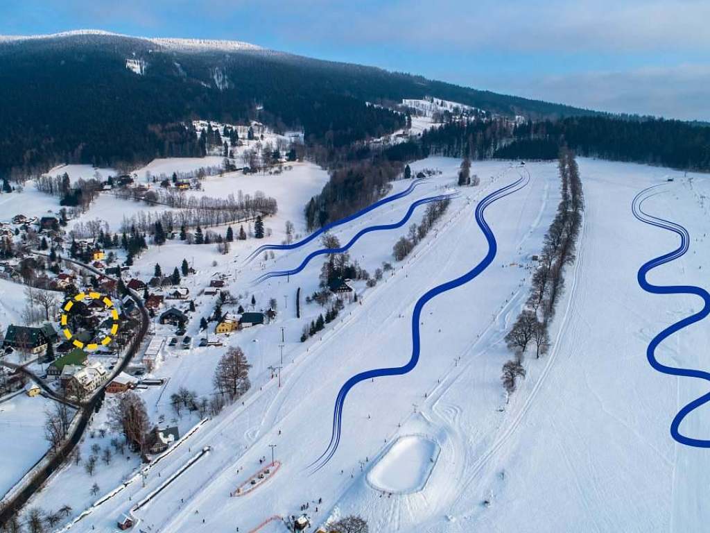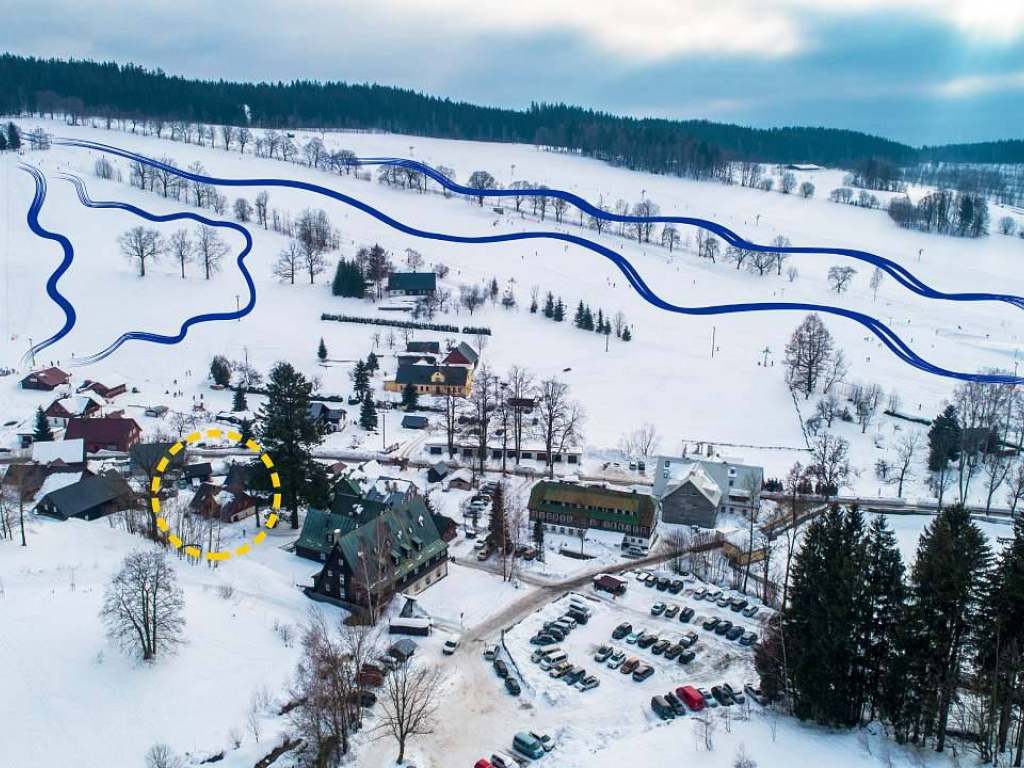 V zimě máme nejideálnější podmínky pro sjezdové lyžování, od dětí a začátečníků až po zdatné sportovní lyžaře. Doporučíme kvalitní lyžařskou školu nebo půjčovnu vybavení. Lyžařské areály jsou přímo u objektu (vzdálenost od 100 m). Pro běžkaře vedou udržované trasy rovněž kolem objektu a napojují se na celý systém tras v Krkonoších nebo Jizerských horách. Hned vedle apartmánů lze jezdit na sáňkách a bobech, které máme zdarma k zapůjčení. Nedaleko je adrenalinová atrakce Snowtubing - ježdění na duších v točitém korytě. Ta funguje i v létě.