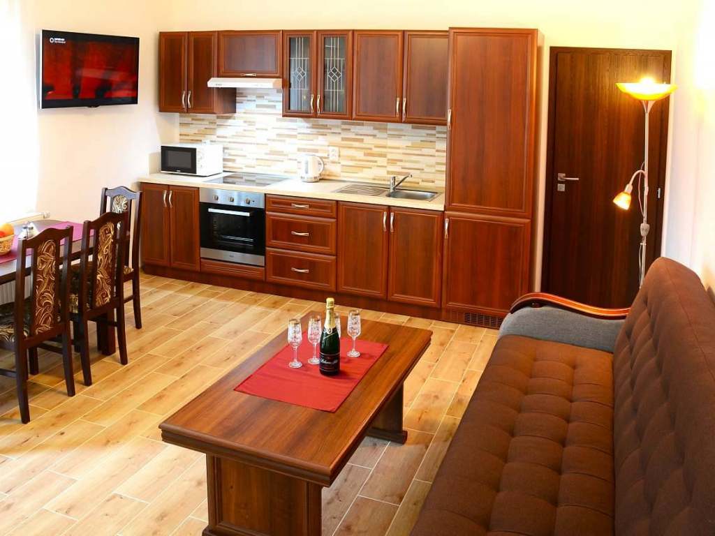 Apartmán č. 1 a č. 2 pro 2 až 4 osoby + možnost 1 přistýlky a dětské postýlky, má obývací pokoj s LED TV úhl. 109 cm, satelitem a WIFI internetem. Jídelní kout a plně vybavenou kuchyni, dvě oddělené ložnice, kde v jedné ložnici je dvojlůžko, které je možné upravit na 2 samostatná lůžka a v druhé ložnici jsou dvě samostatná lůžka. Koupelnu se sprchovým koutem a oddělenou toaletu. Apartmán č. 3 pro 2 až 4 osoby + možnost 1 přistýlky a dětské postýlky disponuje obývacím pokojem s LED TV, kuchyní s jídelním koutem. Kuchyň je kompletně vybavena - sklokeramická varná deska, el. trouba, mikrovlnná trouba, lednice s mrazákem, rychlovarná konvice a komplet nádobí. Apartmán má velkou ložnici se 4 samostatnými lůžky a nebo je možné upravit na manželskou postel a 2 samostatná lůžka. Samozřejmostí apartmánu je koupelna se sprchovým koutem a oddělenou toaletou. Apartmány je možno doplnit o 1 přistýlku a dětskou postýlku. Rozloha apartmánu č. 1 - 65 m². Apartmán č. 2 - 63 m². Apartmán č. 3 - 60 m².