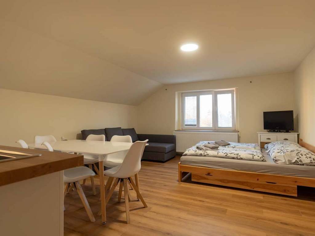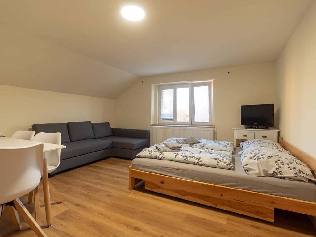 Hlavní místnost: Prostorná obytná kuchyně, ve které se nachází manželské dvoulůžko a pohodlná rozkládací sedací souprava (slouží jako přistýlka pro 2 osoby). Jídelní kout.