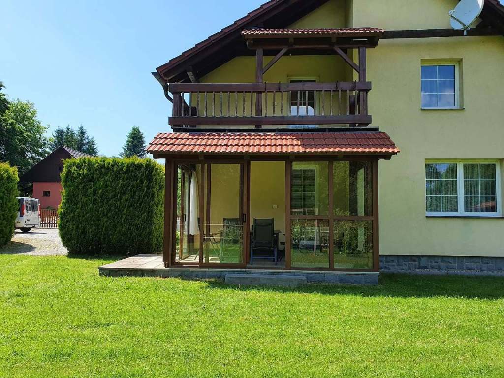 Horní apartmán má k dispozici balkon s krásným výhledem, dolní apartmán disponuje prosklenou terasou, ze které lze vyběhnout přímo na zahradu.