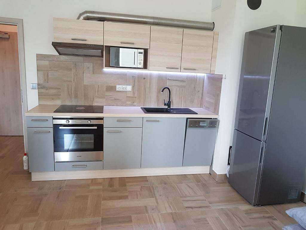 Každý apartmán je vybaven moderním kuchyňským koutem s varnou deskou (troubou), kávovarem, varnou konvicí, topinkovačem, mikrovlnkou, myčkou nádobí, dále pak nádobím (hrnky, talíři, skleničkami na víno a vodu, miskami, tácy, stejně jako nádobím na vaření.