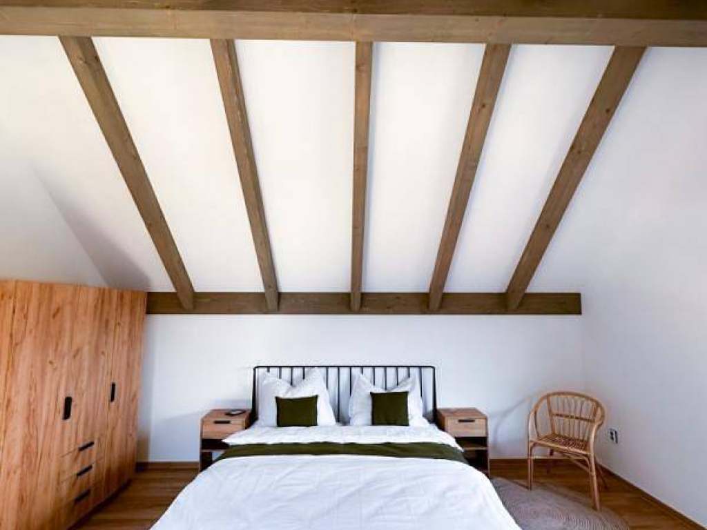 Nabízíme celkem 6 totožných apartmánů. Přízemí: Vstupní chodba s věšákem a skříní. Obývací pokoj s plně vybavenou kuchyní. Patro: Malá ložnice, Velká ložnice, Relaxační koutek.