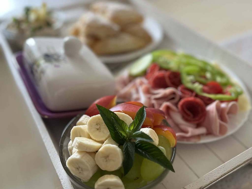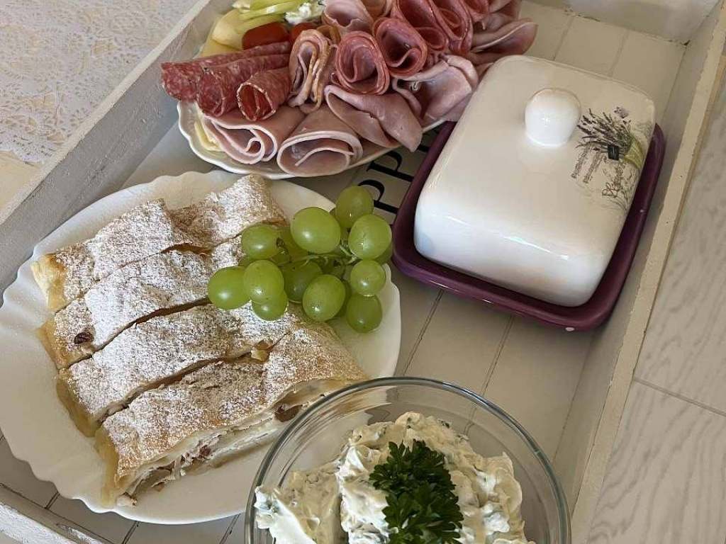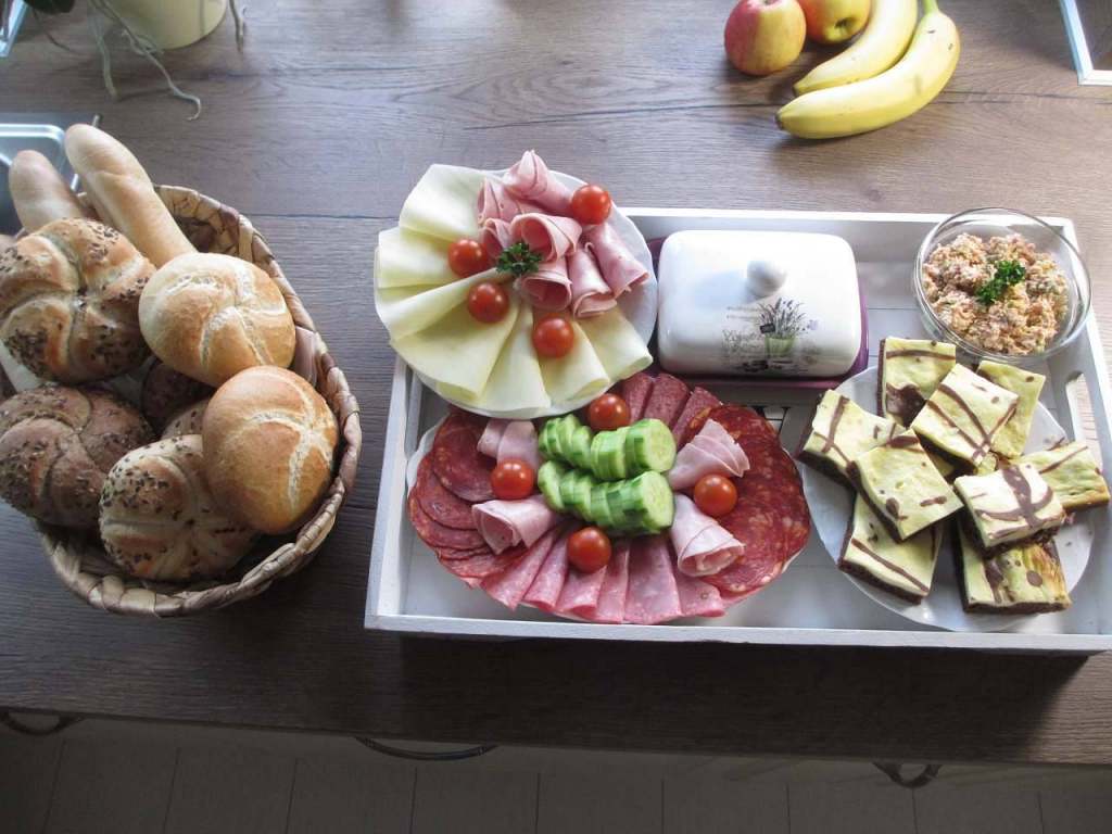 Snídaně na pokoj v ceně. Čas je předem domluven. Kuchyně je vybavená na jednoduché vaření, hosté mají k dispozici, kávu, čaj a dochucovadla. Obchody s potravinami jsou v blízkosti objektu. Nonstop pekárna nabízí stále čerstvé pečivo (ručně dělaný kváskový chléb). Dvě restaurace a čínské bistro jsou asi 10 minut pěšky, více zařízení na obědy a večeře v centru města (20 minut pěšky) a možnost dovážky pizzy. Nově k dispozici v prostorách domu kávovar na espresso.