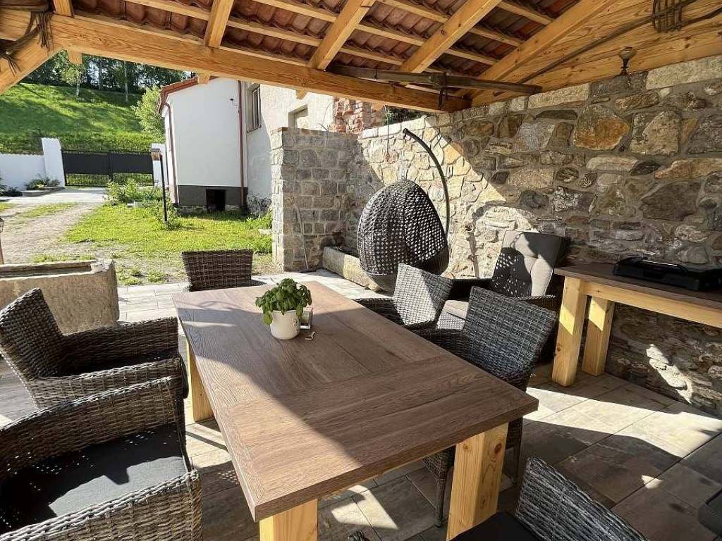 Hned vedle apartmánu je zastřešená veranda k posezení, či jako kuřárna, posezení ve dvorku a houpačka k dispozici.