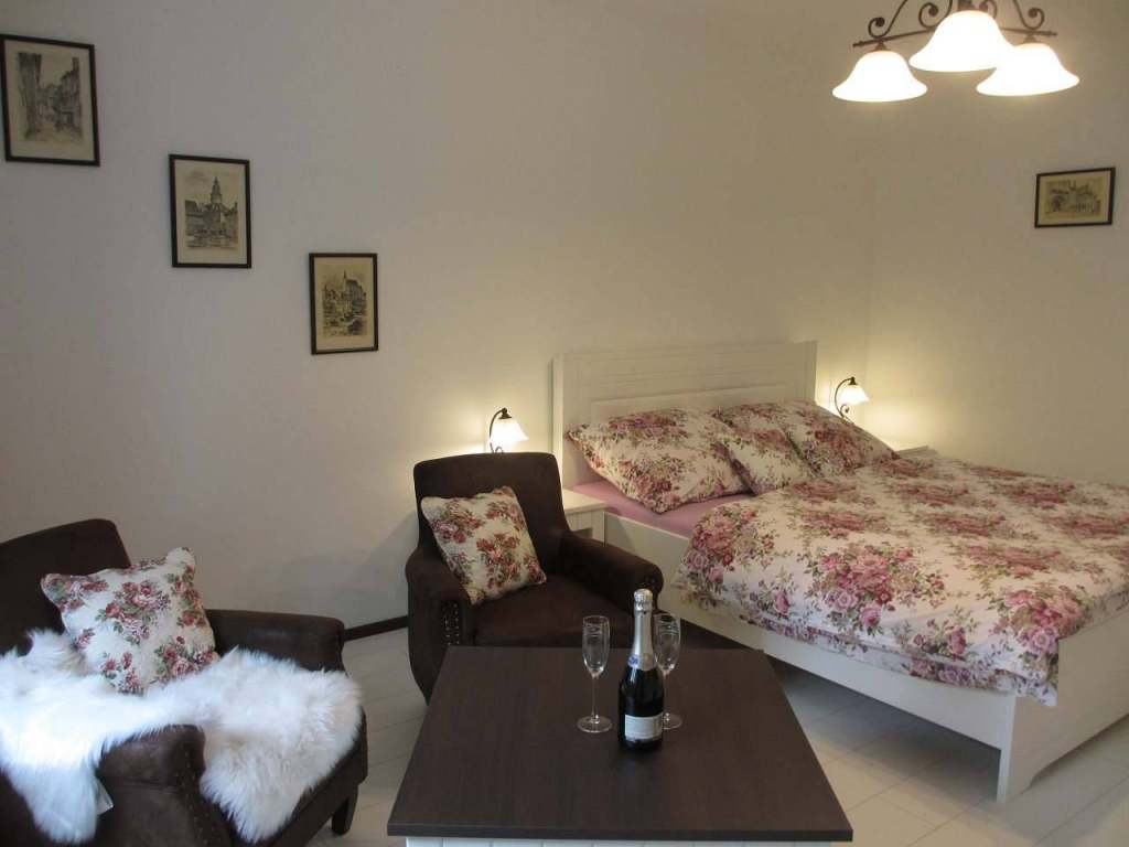 Romantický apartmán má dvě ložnice, kuchyni, předsíň se šatní skříní a koupelnu. Ložnice jsou stejně zařízené, je tam pohodlná manželská postel, komoda, stolek a křesla, televize, noční stolky s lampičkami. Používáme kvalitní povlečení u egyptské bavlny od českých výrobců, pro příjemný spánek. Televize s plochou obrazovkou nabízí základní placené programy včetně archivu, takže si host může pustit svůj oblíbený pořad po návratu z výletu.