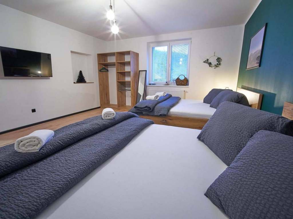 2x manželská postel (160x200 cm) ve 4 lůžkový apartmánu a ve 2 lůžkovém je manželská postel jedna, možnost přistýlky, sprchový kout, ručníky, toaletní potřeby zdarma, TV s plochou obrazovkou, fén, rozkládací pohovka, WiFi.