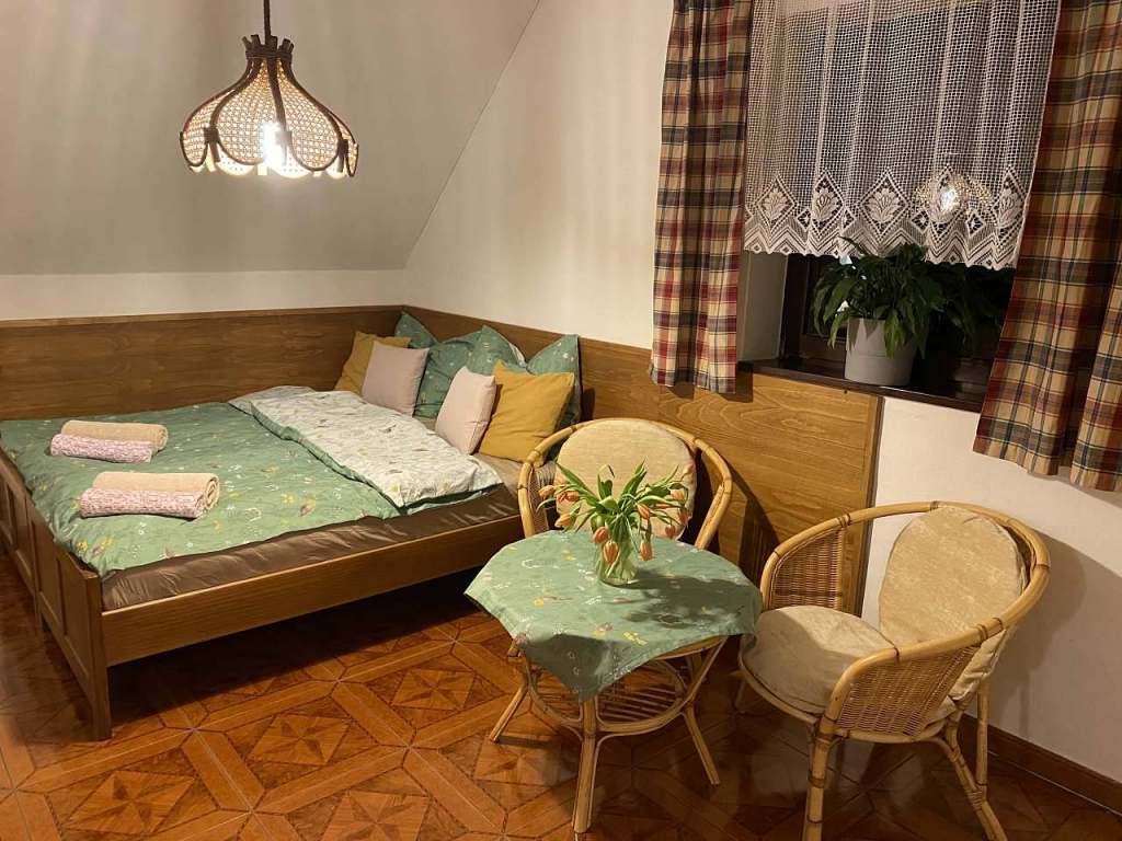 Apartmány jsou situovány v 1.patře. Apartmány mají samostatný vstup. Celá chalupa je vybavena podlahovým vytápěním s tepelným čerpadlem. V koupelnách jsou žebříkové radiátory. K dispozici je ložní povlečení, ručníky a osušky. Apartmány disponují vybavením pro pobyt malých dětí - postýlka, přebalovací podložka, židlička apod. V objektu se nachází tři apartmány, dvoulůžkový a dva čtyřlůžkové s možností přistýlky. Všechny disponují vlastní koupelnou s WC, sprchovým koutem a umyvadlem, rohožkou a ručníky. Mají dostatečné úložné prostory, posezení, komfortní postele včetně povlečení.
