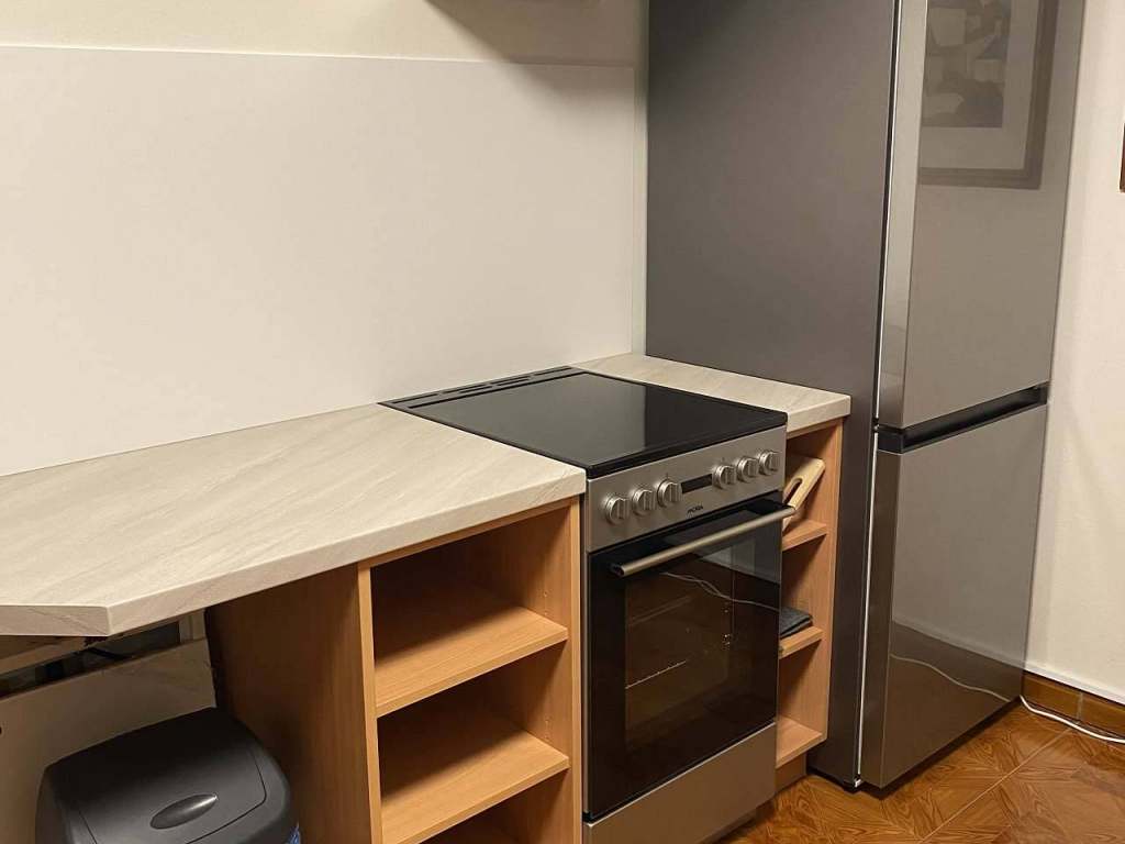 Vybavení kuchyně: lednice, sporák s troubou, mikrovlnná trouba, toustovač, kávovar s kávou zdarma, jídelní stůl a židle.