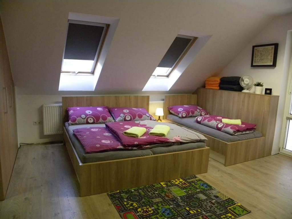 Apartmán I. - Javorový apartmán s infrasaunou Zdarma - v prvním patře a v podkroví domu se samostatným vstupem ze společné chodby domu. Velikost apartmánu je 105m². Skládá se ze dvou pokojů v podkroví, kde jsou umístěné ložnice, z nichž jedna je průchozí. První ložnice je pro 2 - 4 osoby s manželskou postelí a možností 2 přistýlek a druhá ložnice pro 2 - 4 osoby a je vybavena manželskou postelí a 2 samostatnými válendami. V případě potřeby je k dispozici na vyžádání zdarma dětská polohovací jídelní židlička, přebalovací pult s vaničkou a za poplatek dětská postýlka. Dále je v apartmánu v prvním patře jedno samostatné sociální zařízení, plně vybavená kuchyňská linka, která je spojená s prostornou jídelnou se stolem a lavicemi a obytnou společenskou místností s rozkládací rohovou sedací soupravou, LCD TV a minibarem. Součástí místnosti je i fotbálek, a šipky pro dospělé i pro děti.