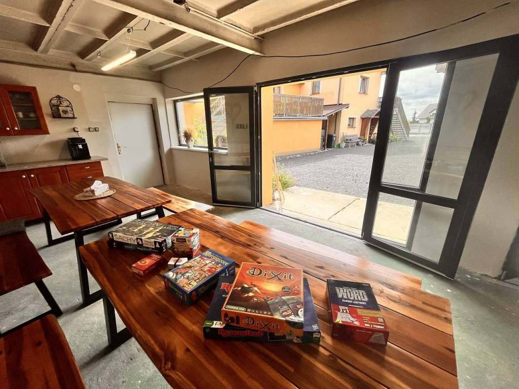 K dispozici je společenská místnost vybavena šipkami, stolním fotbalem, automatickým kávovarem, hosté si mohou sami točit pivo.