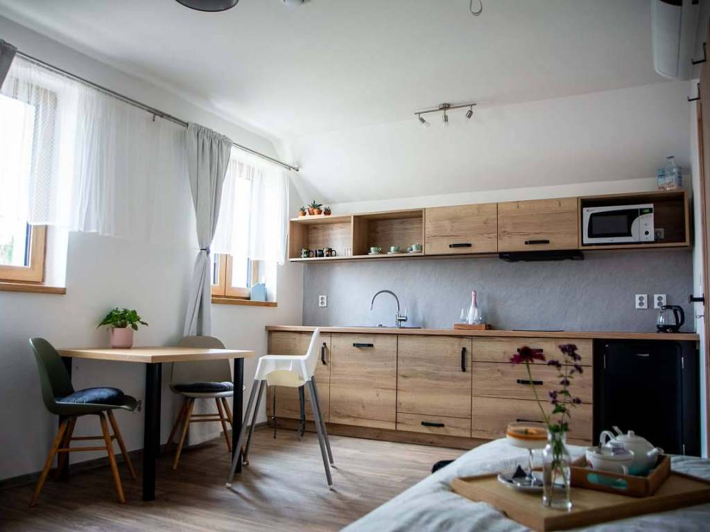 Apartmán Espresso - 2 lůžkový + možnost dětské postýlky: Apartmán s manželskou postelí 2x2m, kuchyňskou linkou a koupelnou se sprchovým koutem a WC. Apartmán se nachází v prvním patře nad kavárnou.