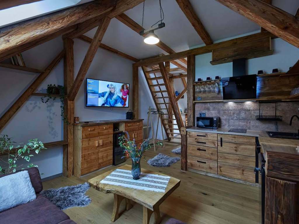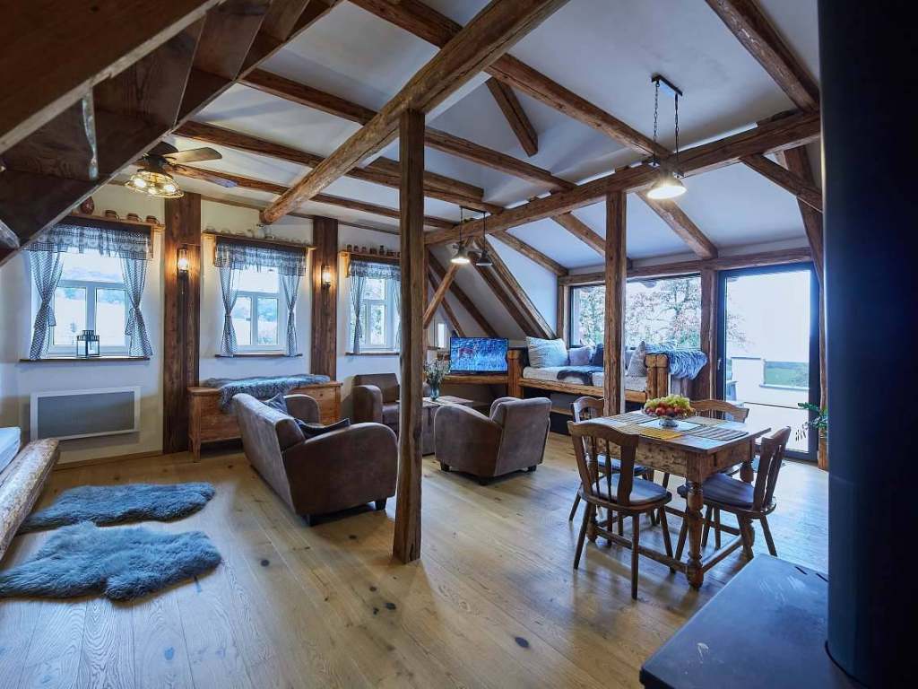 2 x větší apartmán "Kudrnáč" a "Mlejnek" s kapacitou 6+ 1 osoby, disponují venkovní vířivkou na terase s jedinečným výhledem do krajiny.