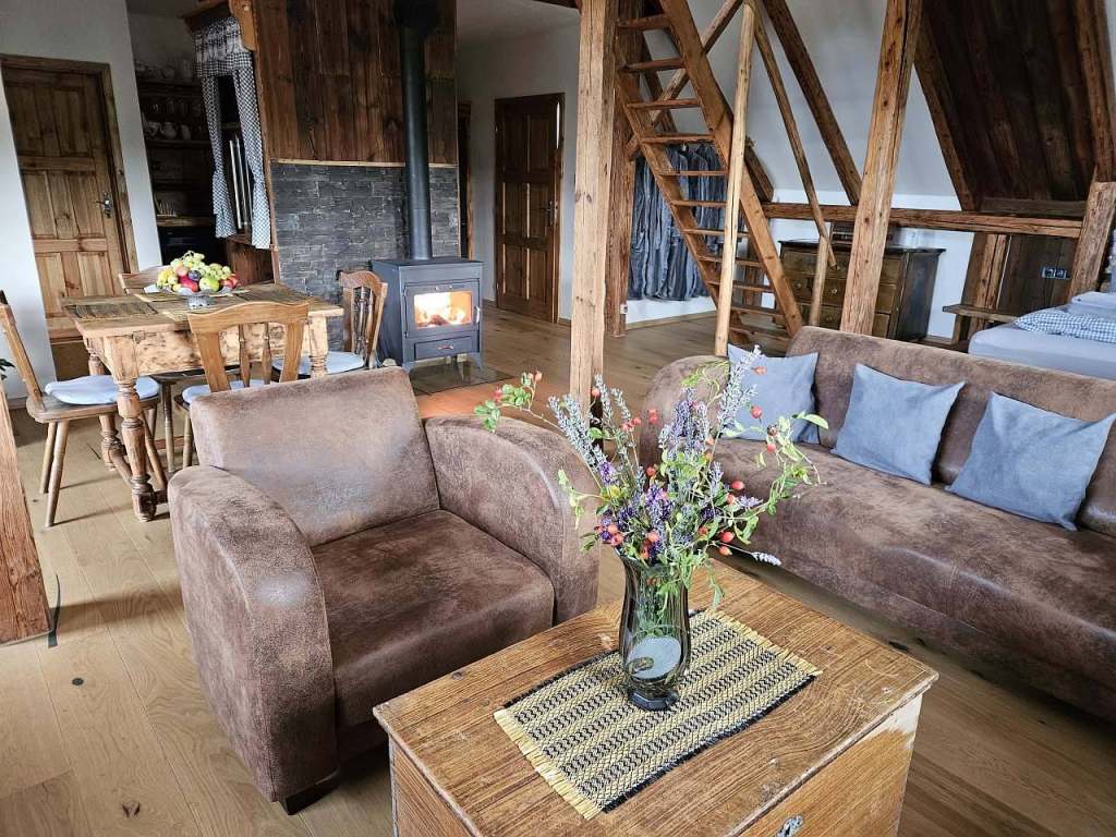 Stylově zrekonstruovaná zemědělská usedlost s 5 apartmány, nacházející se na samotě u lesa s venkovním vyhřívaným vířivým sudem, barem Chlív a ovečkami v zahradě usedlosti.
