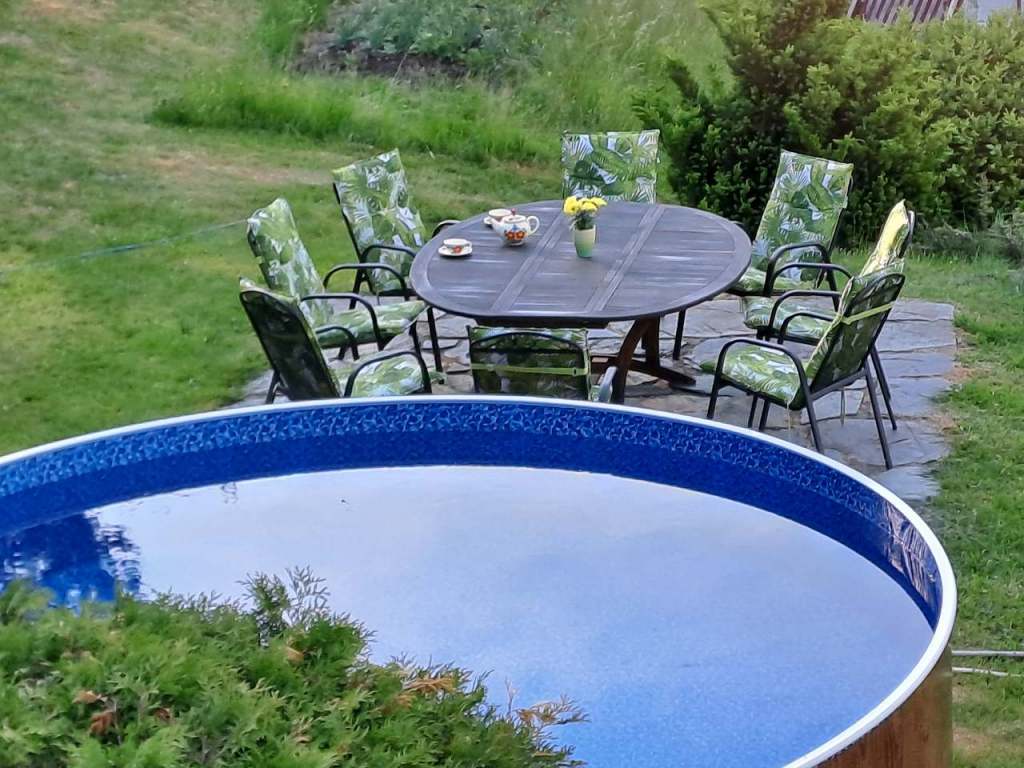 Přes léto (červenec - konec srpna) je venku kulatý osvěžovací bazén (průměr 3,66 x 1,20m), nosnost schůdků do 100 kg, dvě nekrytá posezení, jedno u bazénu, druhé na snídaňové terásce s krásným výhledem, ohniště, gril, pískovišťátko pro děti, trampolína. V zimním období je v okolí do 10 km několik sjezdovek a při příznivých sněhových podmínkách běžecké stopy hned za chalupou. Během vegetačního období je samozřejmě součástí chalupy květinová výzdoba, bez ní by to nešlo, o tu včetně zalévání se staráme my. Okolní krajina je velmi pěkná, bez vlivu průmyslu, což se dá využít ke kratším či dlouhým procházkám. Nacházíme se uprostřed trvale obydlené vesnice, mimo rekreační oblast, a tak je bezpodmínečně nutné dodržovat noční klid dle zákona od 22.00 - 6.00 hod., i Vy si s největší pravděpodobností užijete absolutního klidu. Když budete mít štěstí, přijdou Vás navštívit i srnky. Pronájem je bez IČA, tj. beze služeb, bez personálu, základní úklid si nájemník zajišťuje sám. Ale cokoli budete potřebovat, budeme se snažit zajistit sousedskou výpomocí. Chalupa i okolí je velké a je potřeba, aby při Vašem odjezdu bylo vše v pořádku a srovnané, tak, jak jste to převzali, včetně Vámi použitých spotřebičů, venku i uvnitř. Za chalupu odpovídá objednavatel, (s kterým sepíšeme smlouvu o pronájmu) a též ji osobně odevzdá. Bazén a trampolínu občas též používají děti majitelky, když je přítomna v sousedním objektu, ale tak, aby Vás rušily co nejméně.. Rádi uvítáme všechny slušné lidi, ale O OPILECKÉ MEJDANY ZÁJEM NEMÁME!! O letních prázdninách a na Silvestra pouze týdenní pobyty. Přijďte pobejt a věříme, že se Vám u nás i v našem krásném kraji a navíc krásné chaloupce bude líbit a že budete víc než spokojeni!