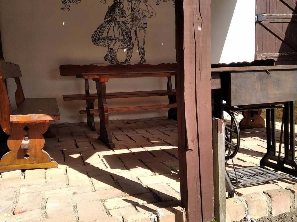 Společenská místnost, stoly a lavice pro 14 osob.