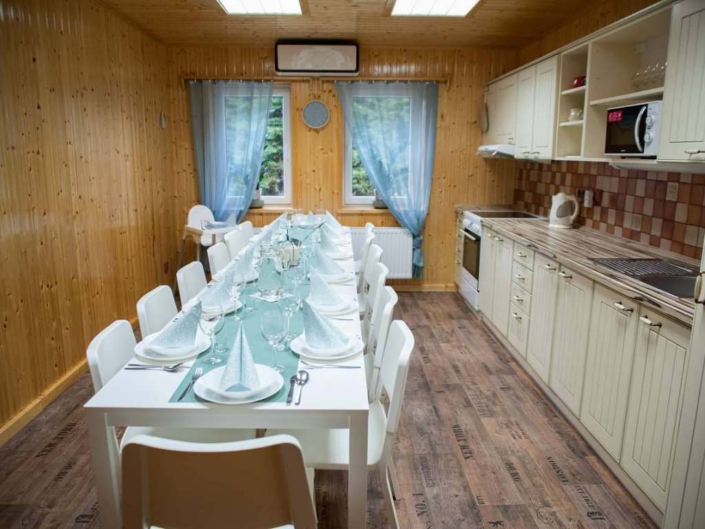 Kuchyně je kompletně vybavená nádobím i nábytkem. Naleznete v ní dva rozkládací stoly, každý až pro osm lidí, 16 židlí a dětskou židličku. Mikrovlnná trouba, elektrický sporák s troubou, 2 x lednice (jedna i s mrazákem), myčka na nádobí, rychlovarná konvice, toustovač, topinkovač i mixér. K dispozici rovněž automatický kávovar na zrnkovou kavu.
