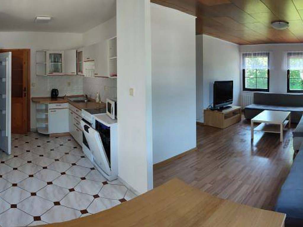 Apartmán o velikosti 3+1 kapacita 6 lůžek: přízemí - vybavená kuchyně s TV (varná konvice, mikrovlnná trouba, el. sporák s varnou deskou a troubou), dvě ložnice(4 a 2 lůžka), koupelna s vanou, samostatné WC.