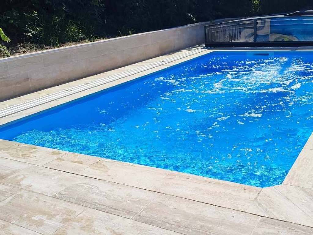 Nový bazén se slanou vodou 6x3x1,4m se zastřešením, osvětlením, protiproudem a venkovní sprchou je v provozu od 15.června do 14.září.