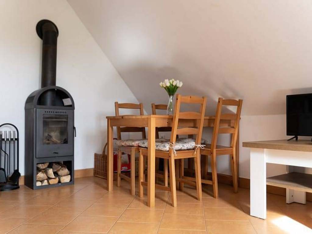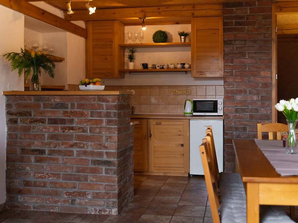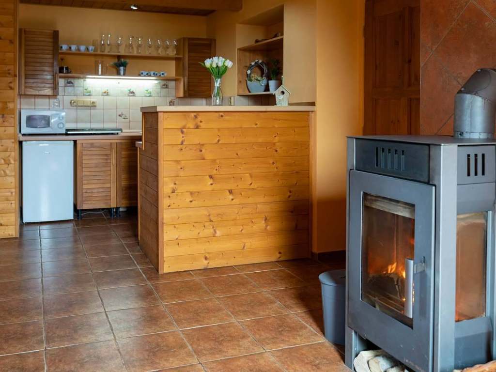 Malé apartmány: kuchyňka s jídelním stolem, rozkládací pohovka, krbem pro příjemnou atmosféru.