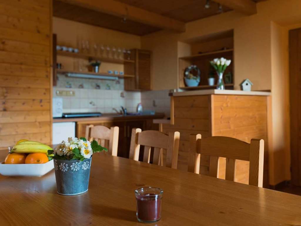 Velké apartmány: ve společenské místnosti naleznete kuchyň s barem, jídelní stůl, krb pro příjemnou atmosféru a TV s připojením na O2TV.