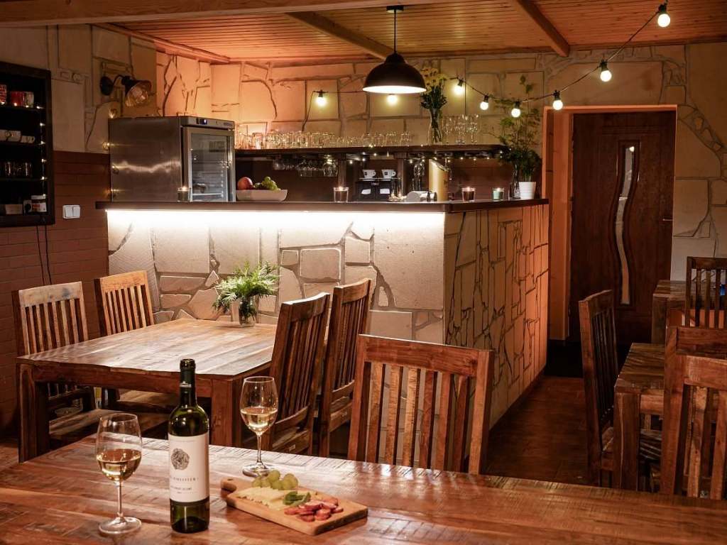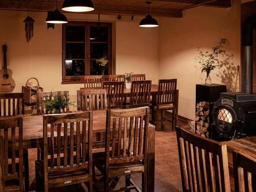 Velká společenská místnost v přízemí s posezením pro 24 osob. K dispozici je zde velký bar s kávovarem a pípou, krbem. Společenská místnost je k dispozici při obsazení minimálně dvou velkých apartmánů. Při obsazení menšího počtu apartmánu vám rádi společenskou místnost zpřístupníme za poplatek 300 Kč/den.