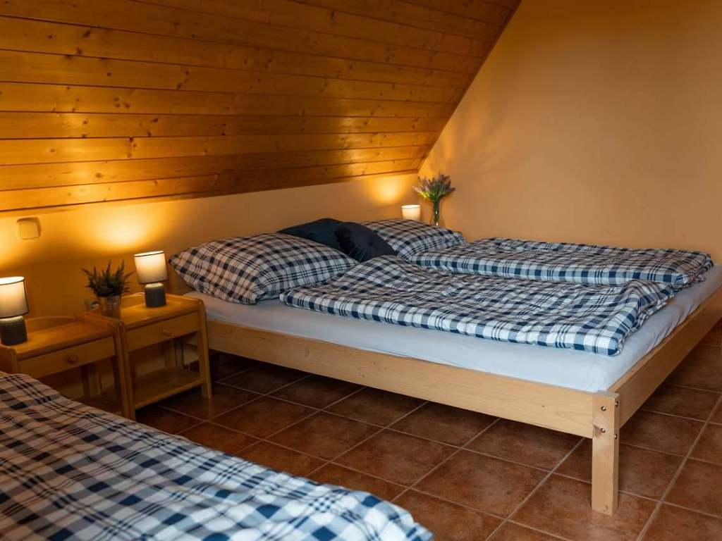 2x rodinný apartmán pro 6 – 8 osob: dvě prostorné ložnice, z nichž každá nabízí manželskou postel a jednolůžko. Obě ložnice propojuje společenská místnost s rohovou sedačkou, již lze taktéž rozložit na pohodlné dvoulůžko.