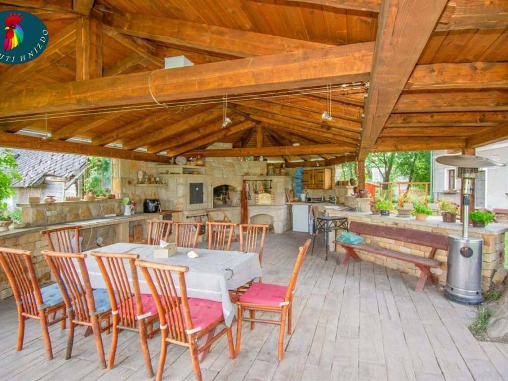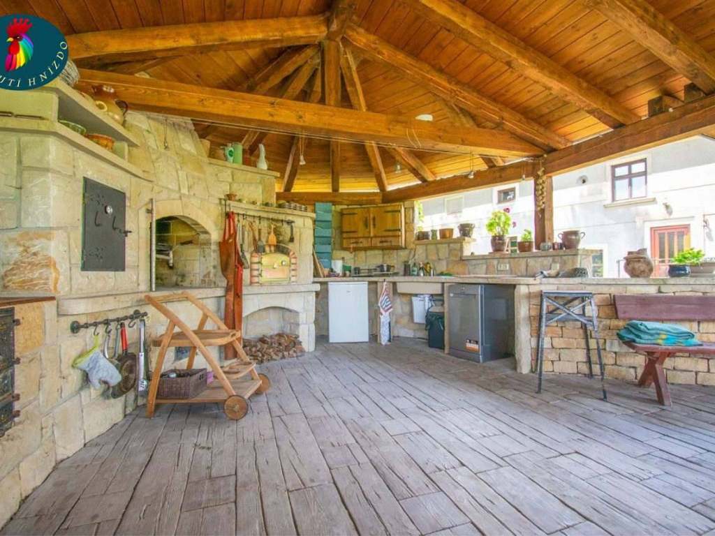 VENKU: Zahradní kamenná kuchyně zastřešená s krbem, udírnou, kamennou "pizza" pecí, indukčním sporákem, myčkou, dřezem.. Plně vybavená včetně nádobí a základních surovin. Zahradní nábytek. 150m od apartmánu je ještě dětské hřiště.