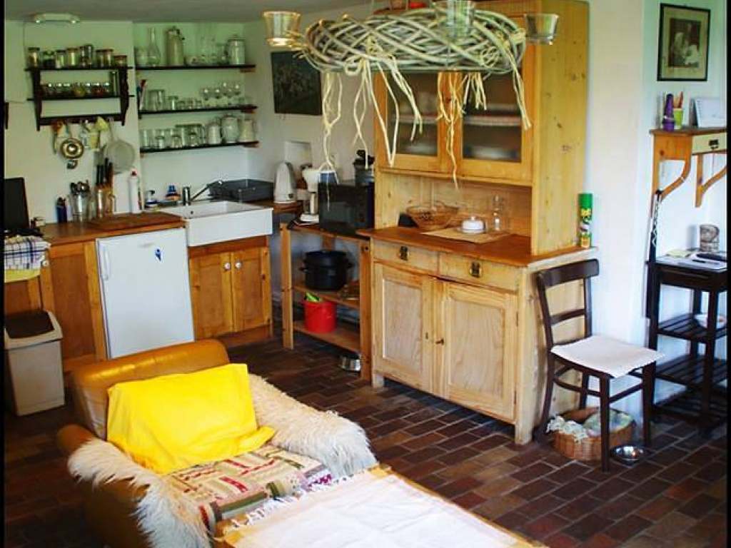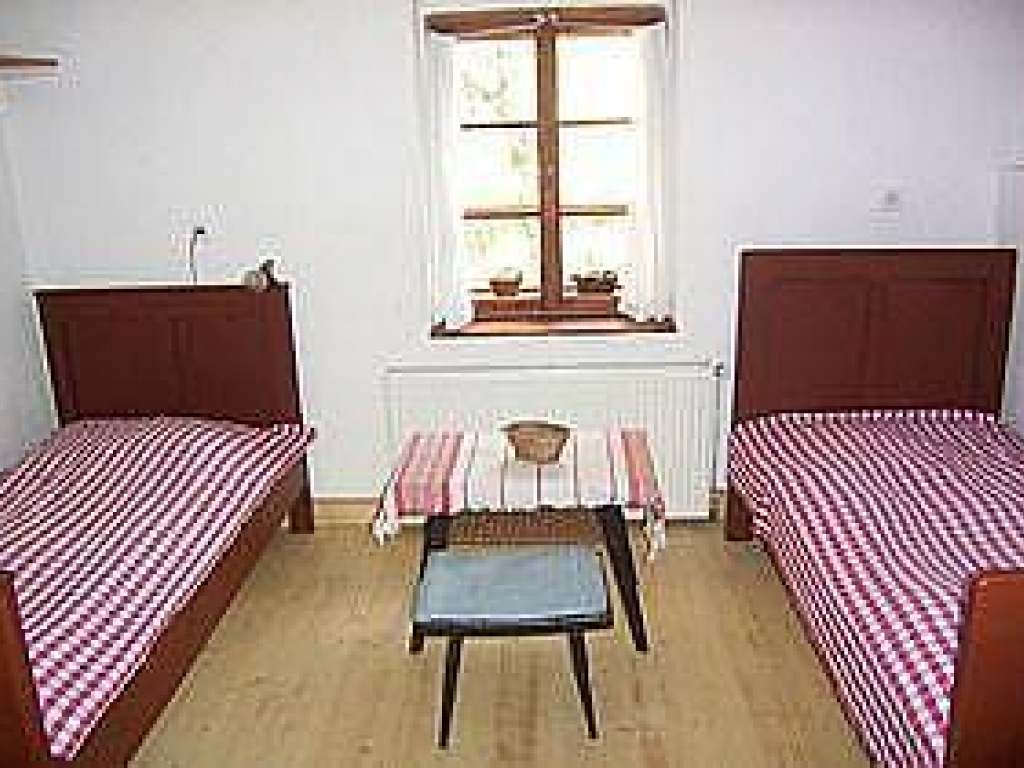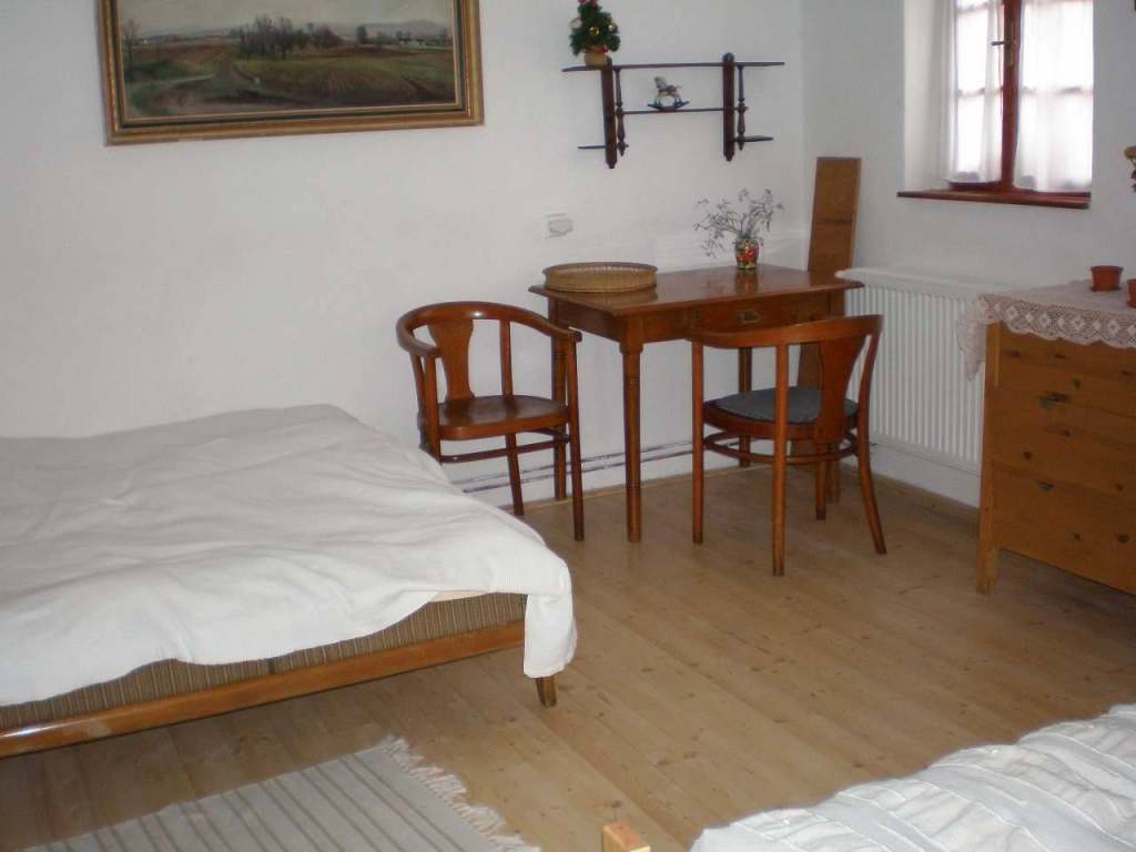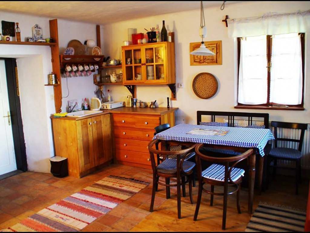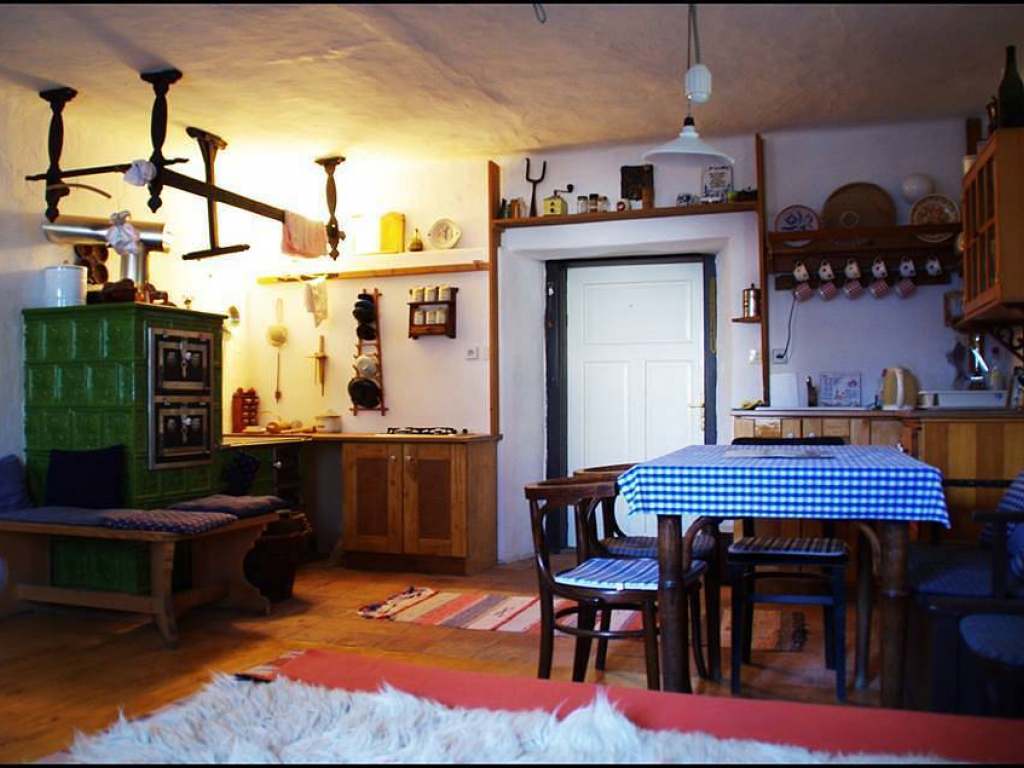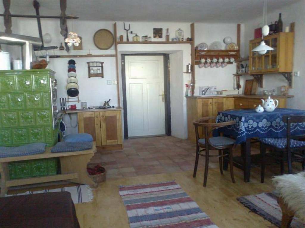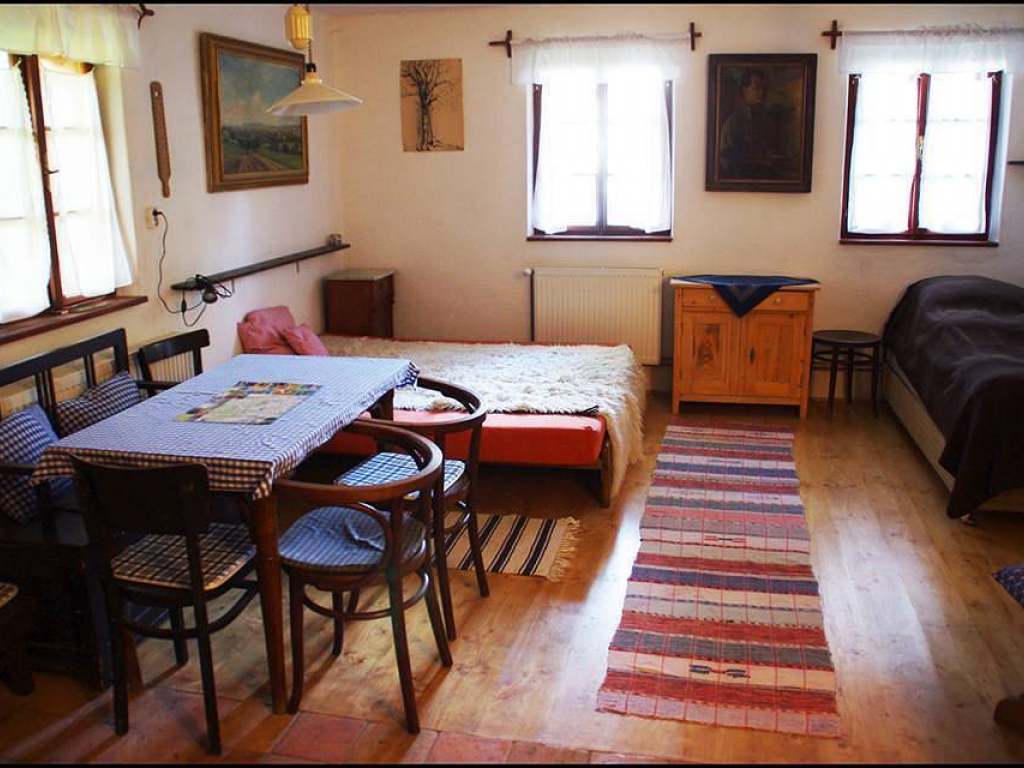 Apartmán 1 pro 5 osob: kuchyň s manželskou postelí a samostatným lůžkem, vybavená kachlovými kamny, plynovým vařičem, mikrovlnkou, kávovarem, varnou konvicí. Ke kuchyni náleží samostatný pokoj se 2 lůžky. Koupelna se sprchovým koutem a WC.