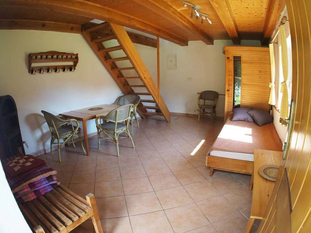 V patře se nachází oba pokoje, společná kuchyňka s vybavením a v přízemí je společenská místnost s krbovými kamny a sezením. přízemí a první patro jsou propojeny schody, které se dají uzavřít brankou pro bezpečný pohyb dětí.