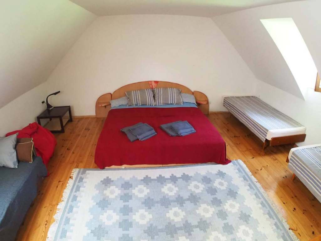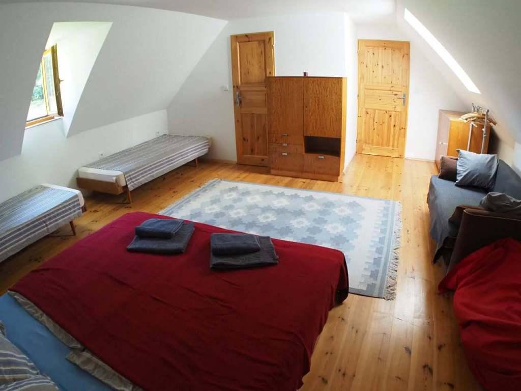 Velký pokoj je vybaven manželskou postelí, dvěma postelemi, stolkem, židlemi a skříní.
