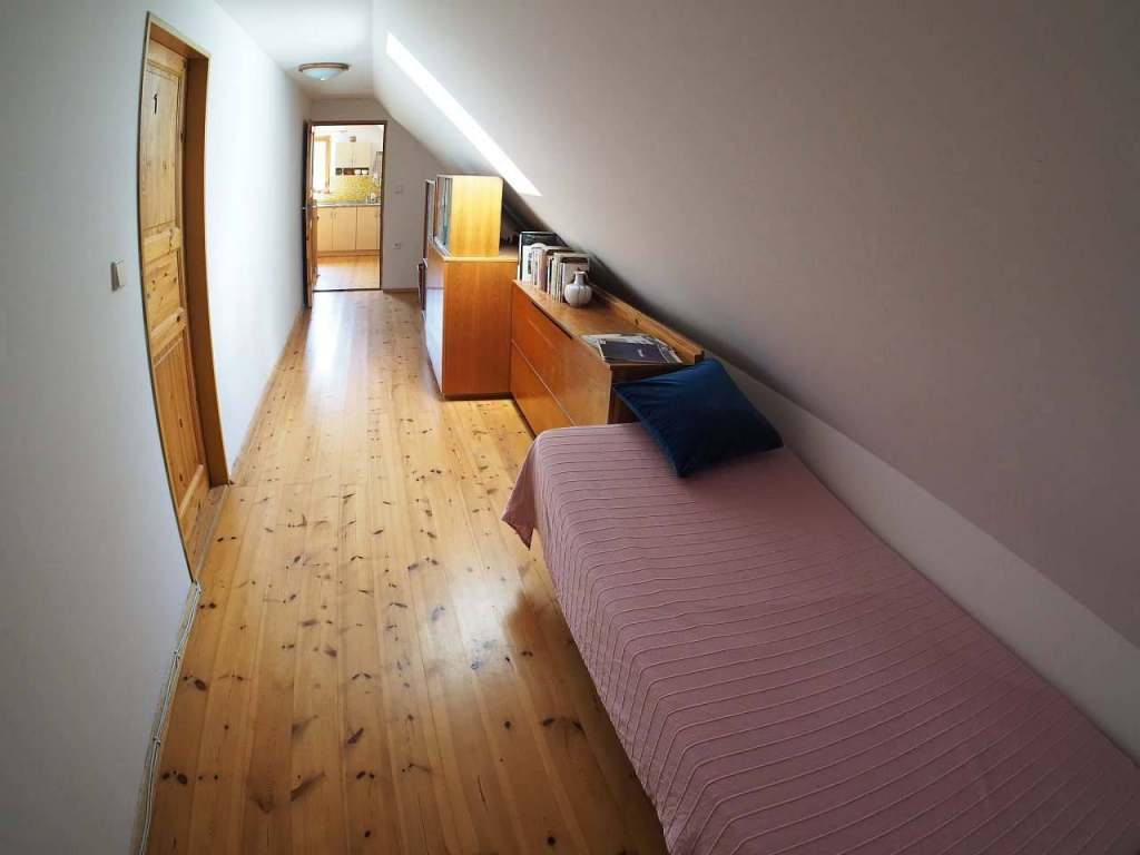 Menší pokoj je manželskou postelí, rozkládací(výsuvnou) postelí pro dva, skříní, stolkem a židlemi.