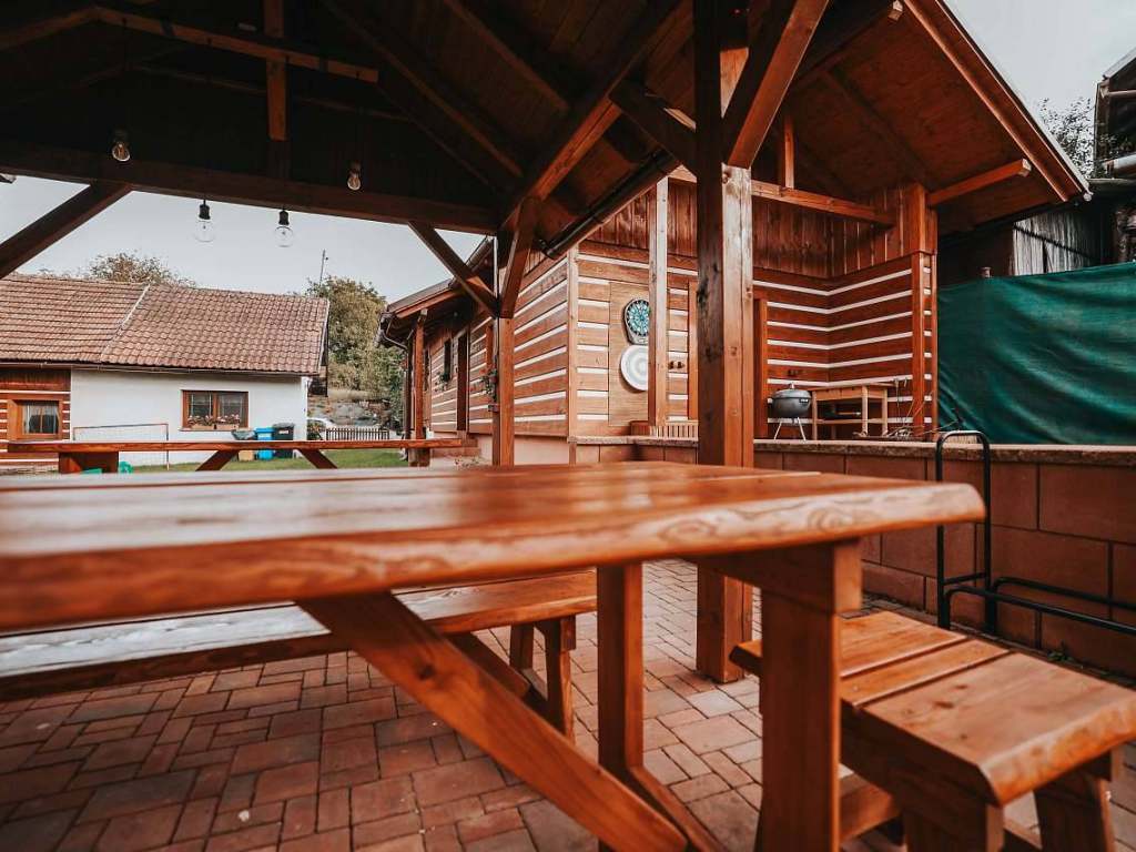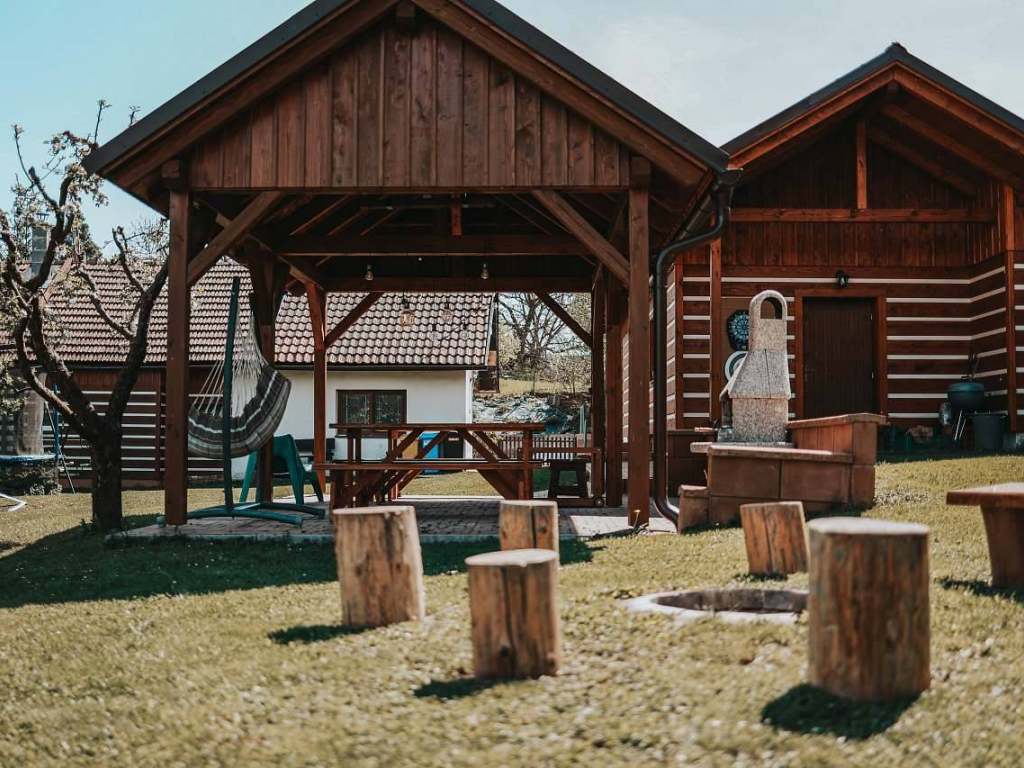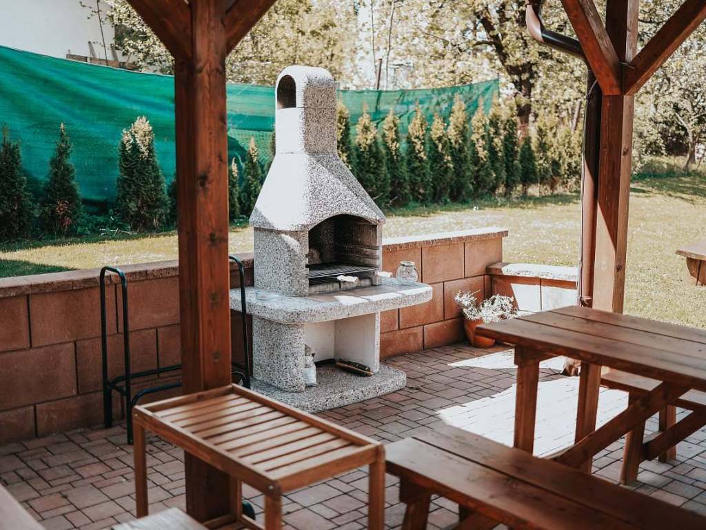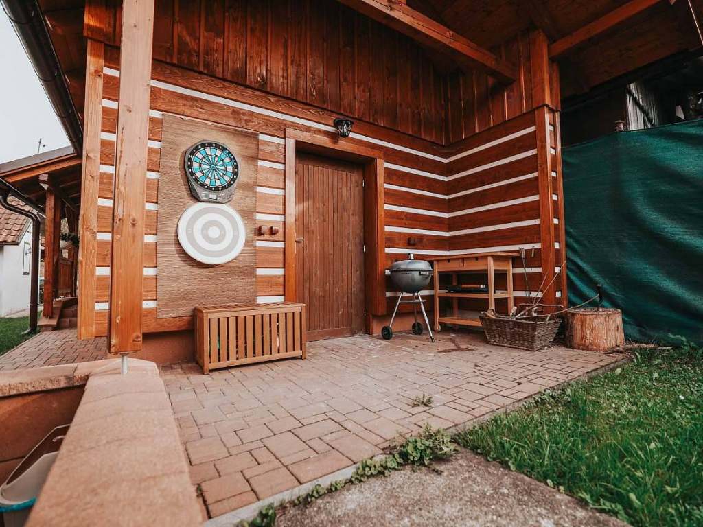 Na zahradě je možné využít gril a elektronické šipky v zastřešené pergole, úschovnu kol, dětské hřiště (houpačka, trampolína, fotbalové branky, badminton a pétanque).