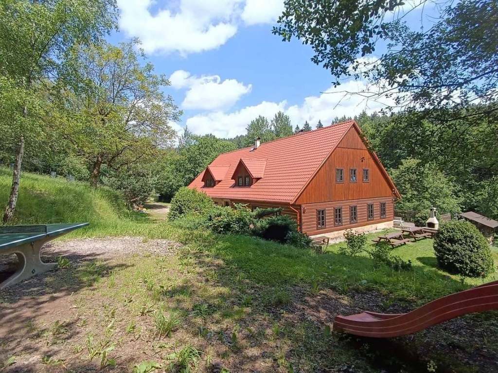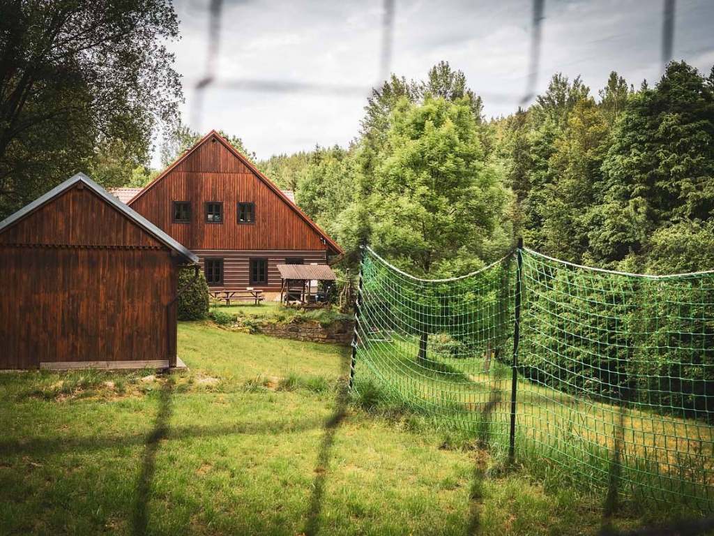 K domu přiléhá rozsáhlý tříhektarový pozemek s velkou loukou ohraničenou lesem. Jejím údolím protéká divoký Borecký potok.
