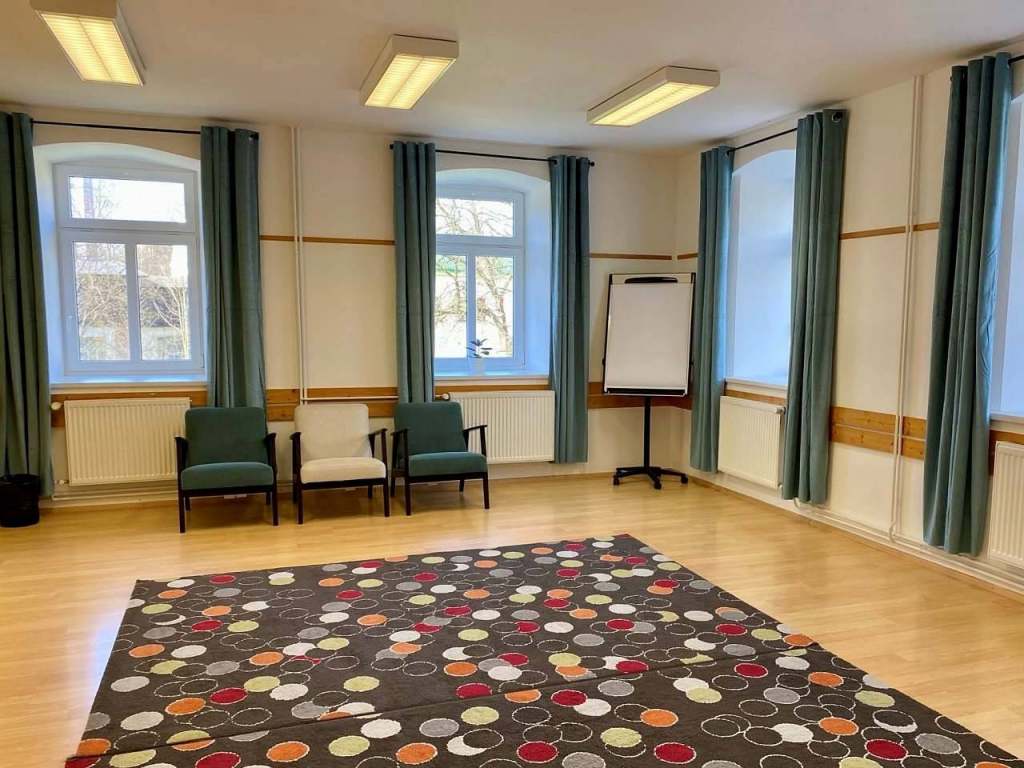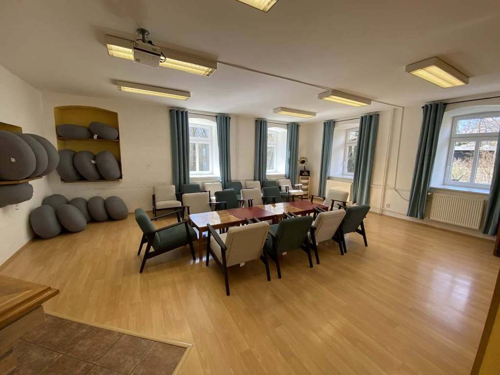 Dále je možné využívat společenskou místnost v přízemí, ta nabízí křesílka, židle, stoly, dataprojektor s plátnem a krb, dá se přepažit na dvě místnosti.
