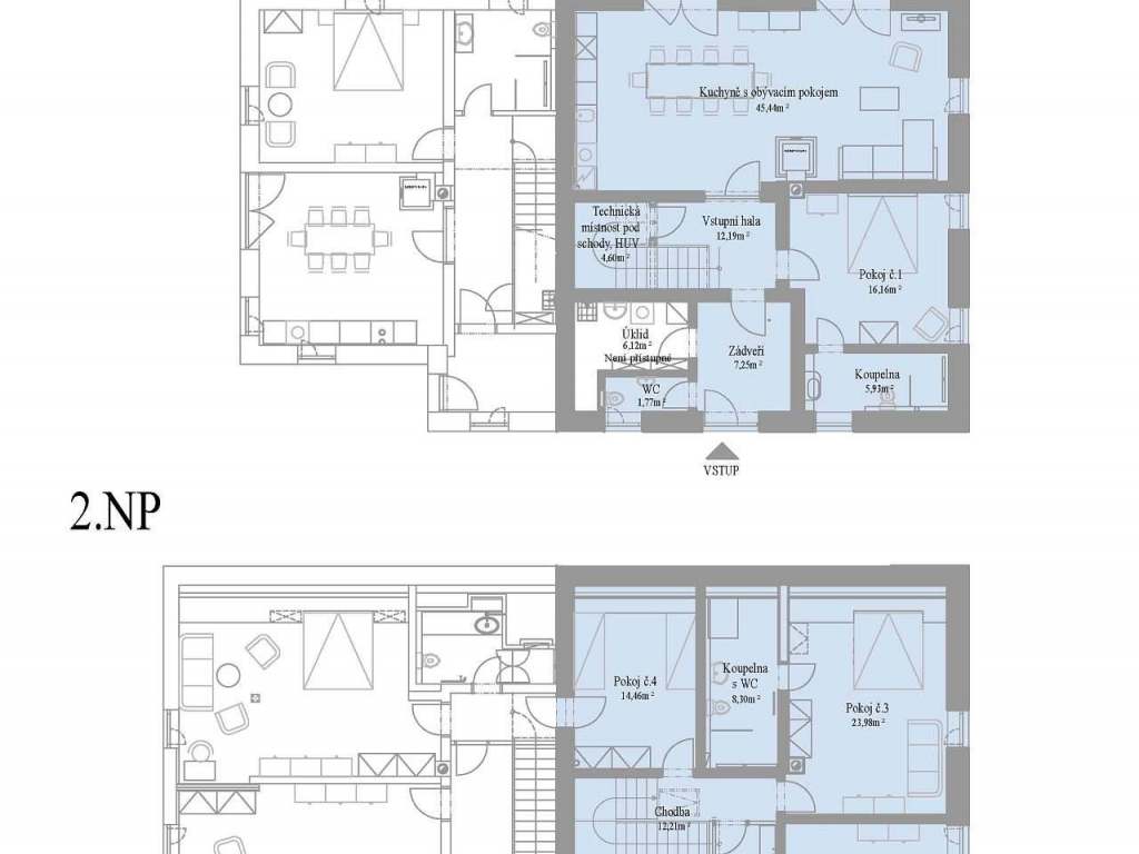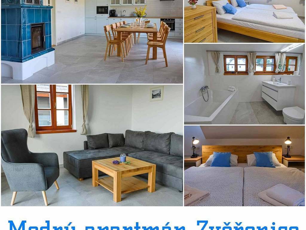 - V Apartmánu #1 - Modrý apartmán – se nacházejí 4 ložnice (1 ložnice v přízemí, ostatní v 1.NP) se samostatným sociálním zařízením a 1 dvoulůžkový pokoj bez sociálního zařízení (1.NP).