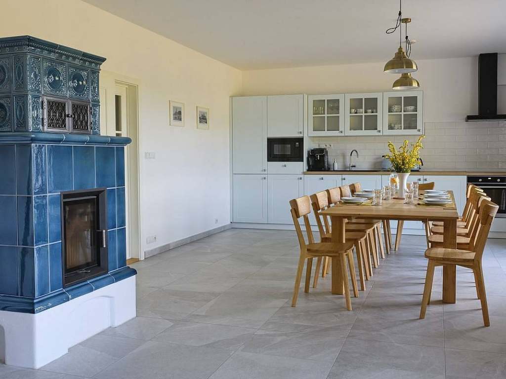 Dále je zde plně vybavená kuchyně, dřevěný stůl, kde se pohodlně usadí 8 lidí, dětská židlička a kachlová kamna.