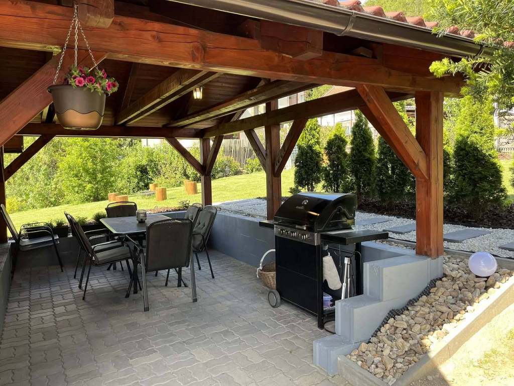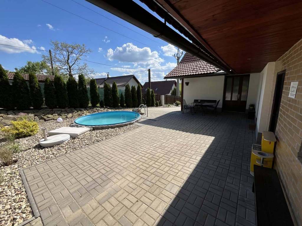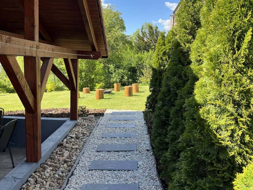 Na společné oplocené okrasné zahradě je k dispozici parkovací plocha, vstupní terasa s posezením, dále krytá pergola s posezením a plynovým grilem, bazén se slanou vodou, wellness (sauna s odpočívárnou, ochlazovací vana PoseidonTub), relaxační křesílko na zahradě a houpačka.