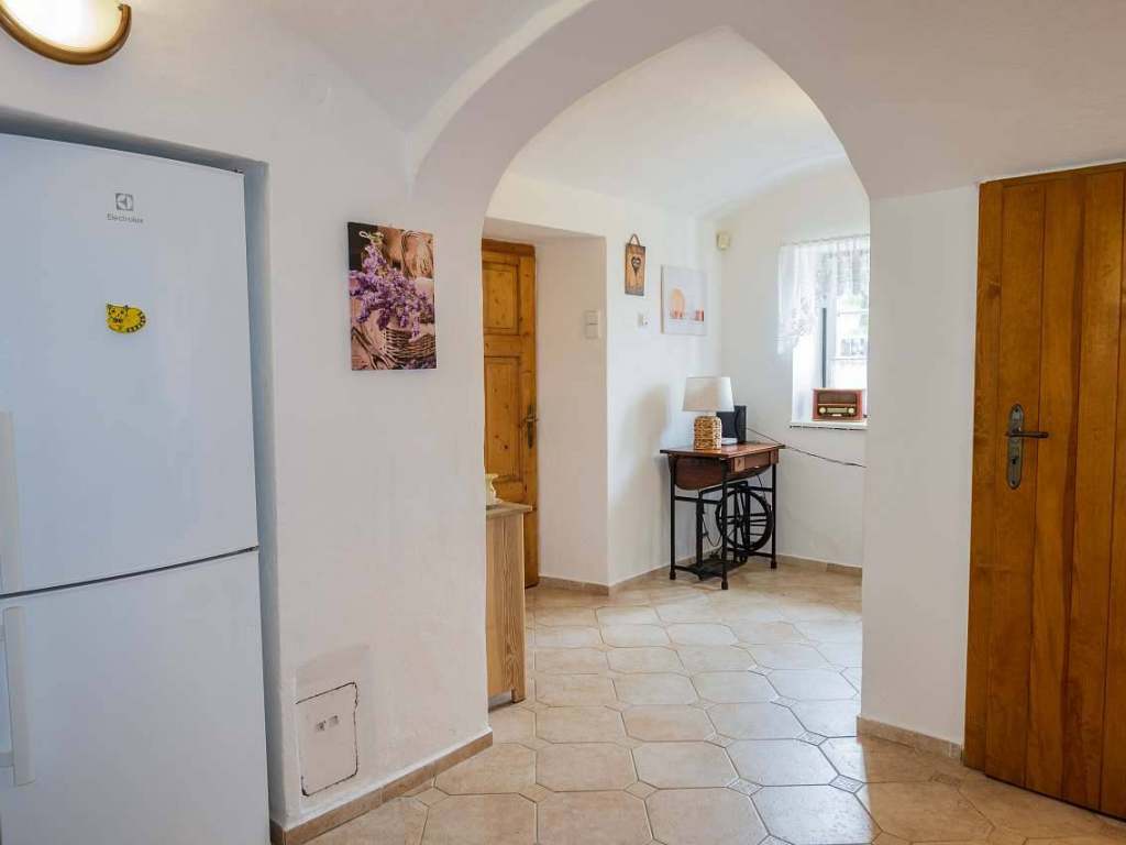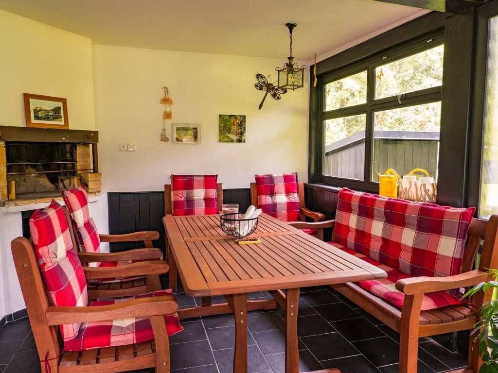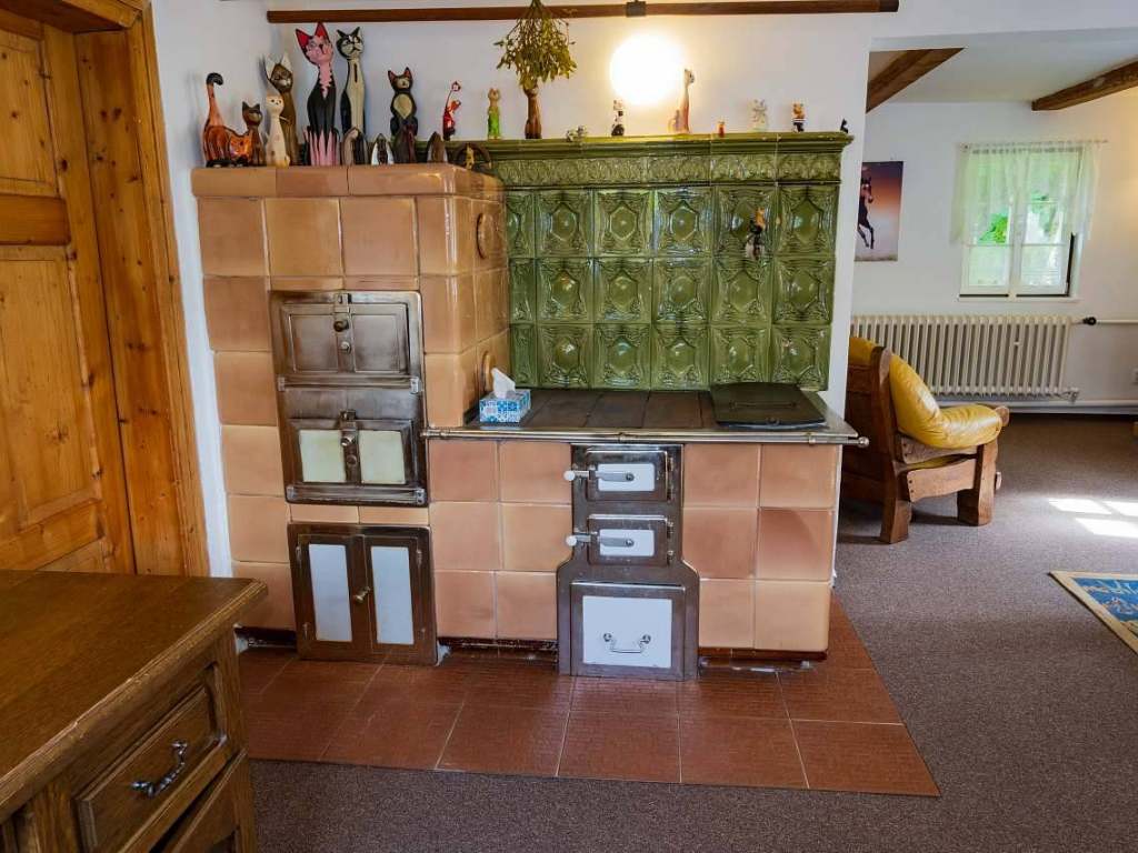 1NP: Obývací pokoj spojený s jídelnou, vybavený kachlovými kamny, které vytvářejí útulnou atmosféru. Plně vybavená kuchyně. Koupelna a samostatné WC. Zimní zahrada: Posezení u krbu s nádherným výhledem do přírody a na zahradu. Tudy je také vstup do chalupy.