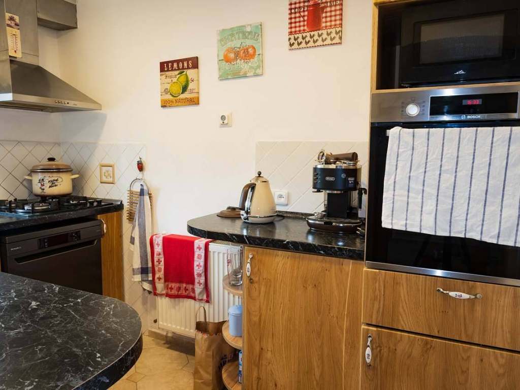 Kuchyň: trouba, mikrovlnná trouba, myčka, kávovar, rychlovarná konvice, topinkovač, plynový sporák
