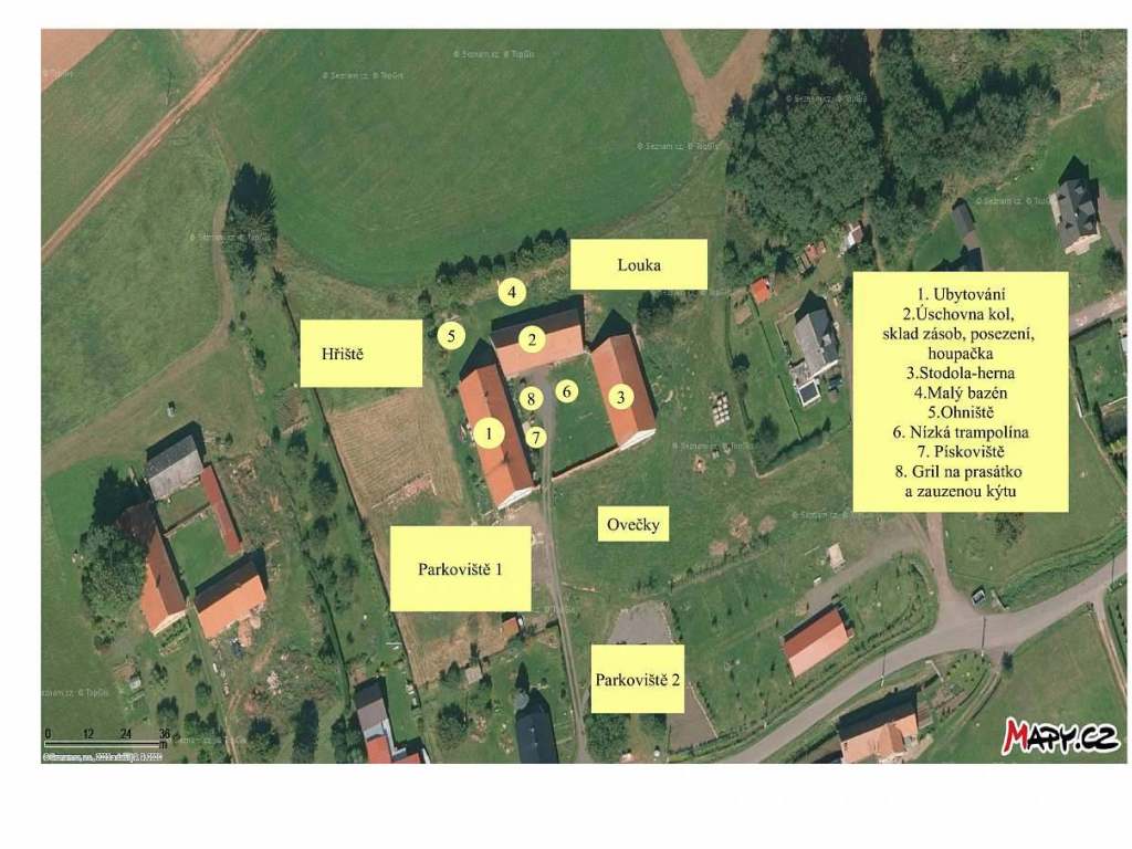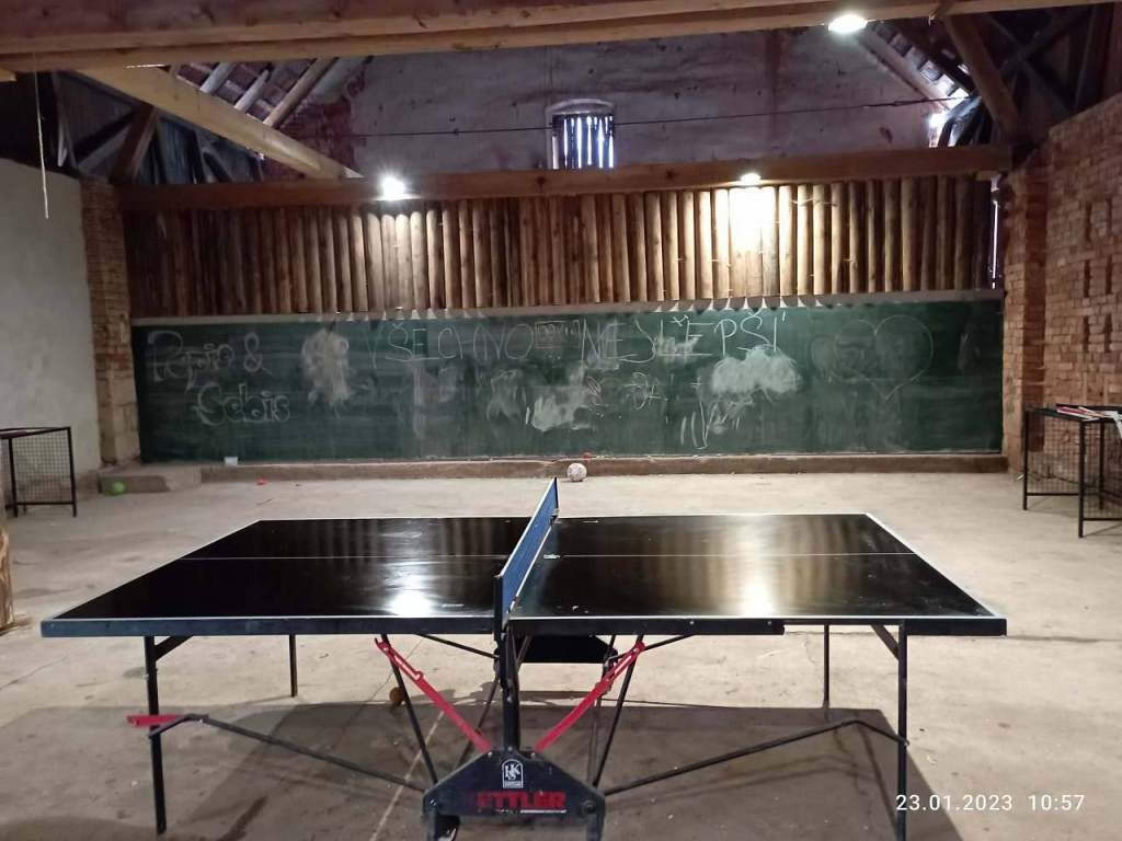 Projektor, počítač, pivní pípa na dva druhy piva a dva druhy limonády, TV, stolní tenis, y, malé branky na floorbal, velká tabule na kreslení křídou, úschovna kol pro 30 kol, hřiště, nízká trampolína, velký gril na 70.kg prasátko, malý gril, udírna, malý bazén, ohniště, dva velké mrazáky, dvě velké chladící vitríny, 4 ledničky, 6 sporáků, myčka, pračka, barevný projektor, disco koule, ozvučení společenské místnosti. Sklad zásob+černá kuchyně, velká herna ve stodole, finská elektrická sauna, vířivka.
