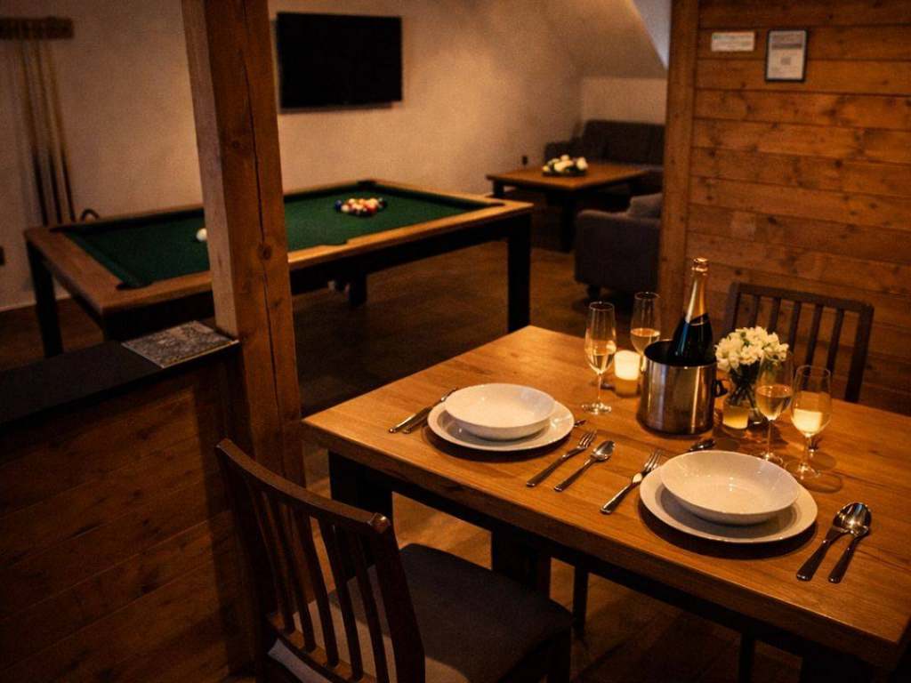 Plně vybavené kuchyně včetně myčky, lednice, sklokeramické desky, mikrovlnné trouby, horkovzdušné trouby jak v přízemí tak v podkroví, obývací pokoje a ložnice s led TV, WiFi, Wellness s vířivkou a saunou pro 4 osoby, možnost masáží, velký venkovní zastřešený bazén s rozměry 8x4x1,5 m s pergolou, šipky, kulečník, samostatné ložnice, WC, 3 koupelny, rozlehlý pozemek, parkování u objektu, terasa s posezením a grilem, možnost grilování, venkovního posezení za každého počasí.