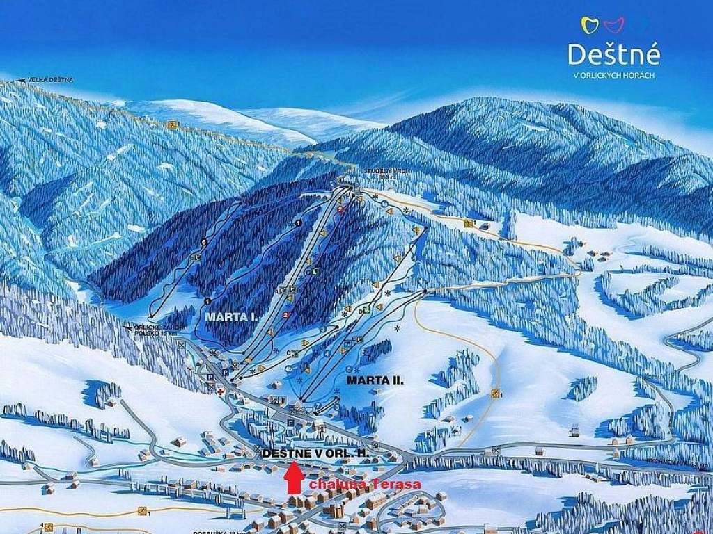 ZIMNÍ sezóna: Největší a nejvybavenější skiareál v Orlických horách, sjezdovky jen 250m od chalupy (lanovky: 4sedačková + 2sedačková + několik kotev a pom). Výborné podmínky pro sjezdové i běžecké lyžování (stopy hned za domem). Lyžařská školka a škola, sáňkování na upravených svazích. Ve skiareálu se konají významné akce s doprovodnou zábavou. 7km od Deštné se nachází Polská SKI aréna ZIELENIEC - přístup z České strany od Masarykovy boudy. 21km sjezdovek, kabinová lanovka, 4x sedačková... Zimní středisko na vysoké úrovni.