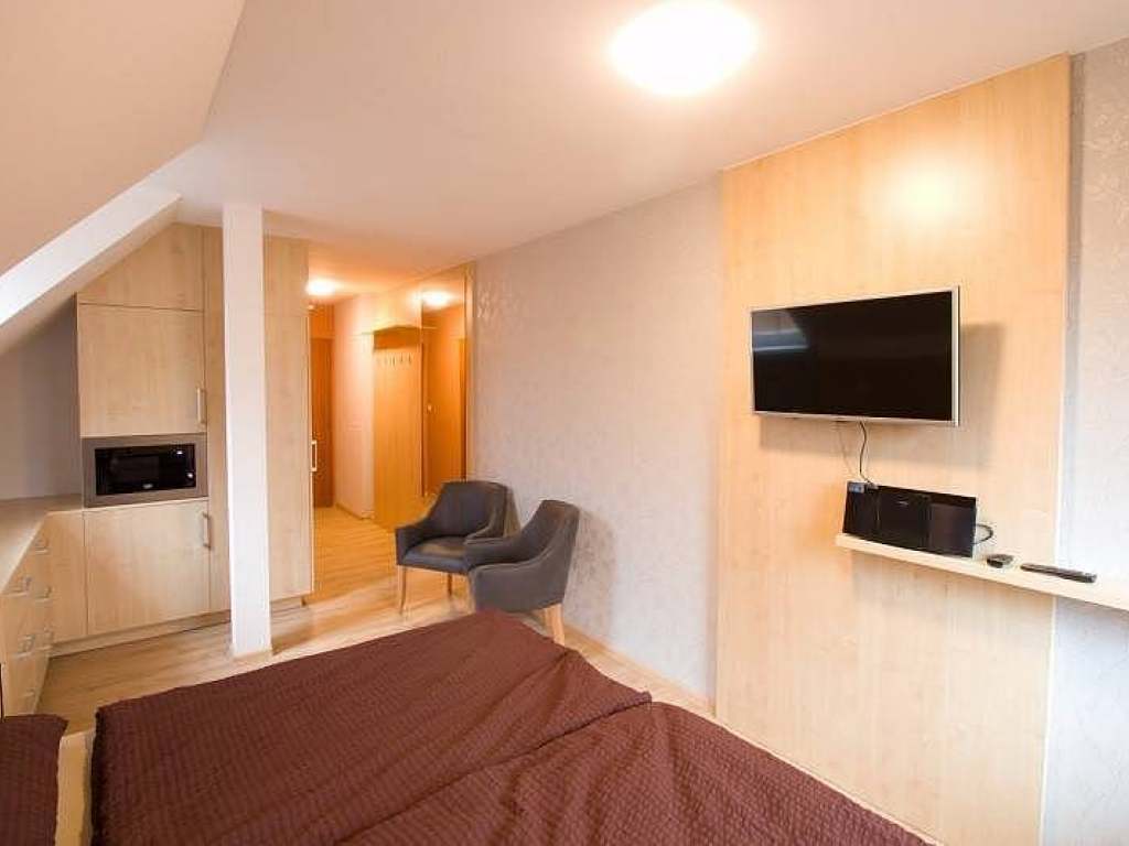 Na každém pokoji je TV, rádio a vestavěná mikrovlnná trouba na přihřátí potravin. Ve společenské místnosti je kompletně vybavená kuchyň s kombinovanou ledničkou, troubou, mikrovlnnou troubou, indukční deskou, varnou konvicí, toustovačem a myčkou. Veškerý jídelní servis je součástí kuchyně. Ve společenské místnosti je k dispozici TV a rádio.